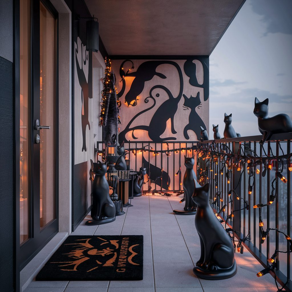 Capture the mysterious and enchanting essence of black cats with Halloween balcony decorations that are simple, yet striking, and perfect for DIY enthusiasts. Place several black cat figurines or models along the edge of the balcony, ideally near pumpkins or plants, to create a captivating scene.