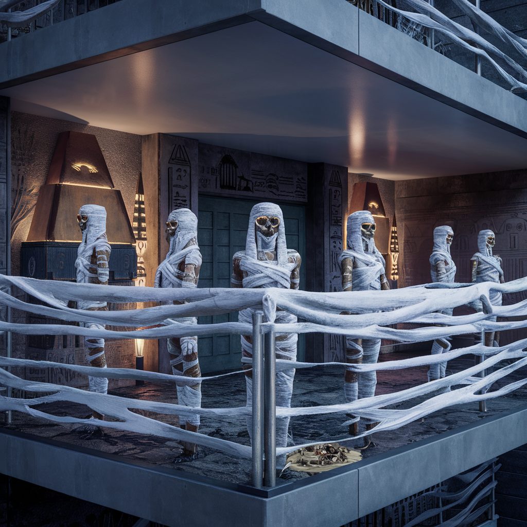 Turn your balcony into a scene straight from ancient times with a mummy-inspired Halloween décor theme. Wrap pieces of white cloth or gauze around the railings, furniture, and even potted plants, mimicking the appearance of mummies emerging from the shadows. Arrange the mummies as if they are slowly waking from the darkness, adding a chilling touch.
