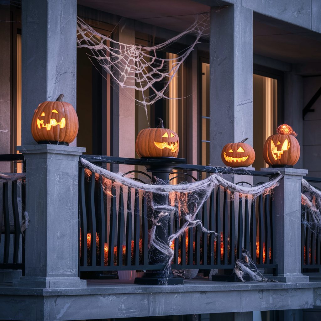 No Halloween balcony decoration is truly complete without the iconic addition of spider webs. Begin by stretching faux spider webs across the balcony railing, corners, and even the ceiling to create a chilling, haunted effect that will instantly set the tone.