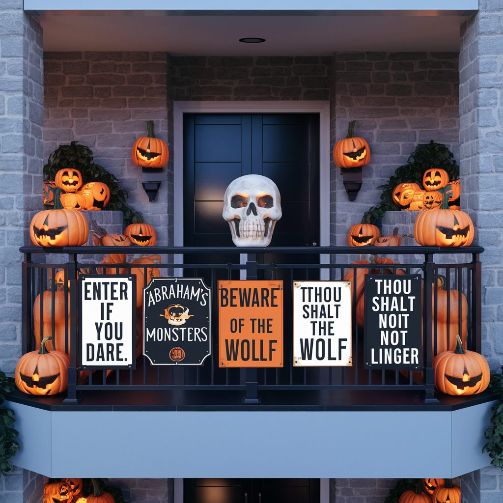 Banners and signage are fantastic additions for DIY Halloween balcony decorations, offering an easy yet impactful way to inject a sense of fright into your outdoor space. Consider using bold signs with chilling phrases like “Enter If You Dare” or “Beware of Ghosts,” written in creepy, ominous fonts that immediately catch the eye. Hang these signs from your balcony railing, accompanied by banners adorned with classic Halloween motifs such as skulls, pumpkins, or witches, to enhance the spooky vibe.
