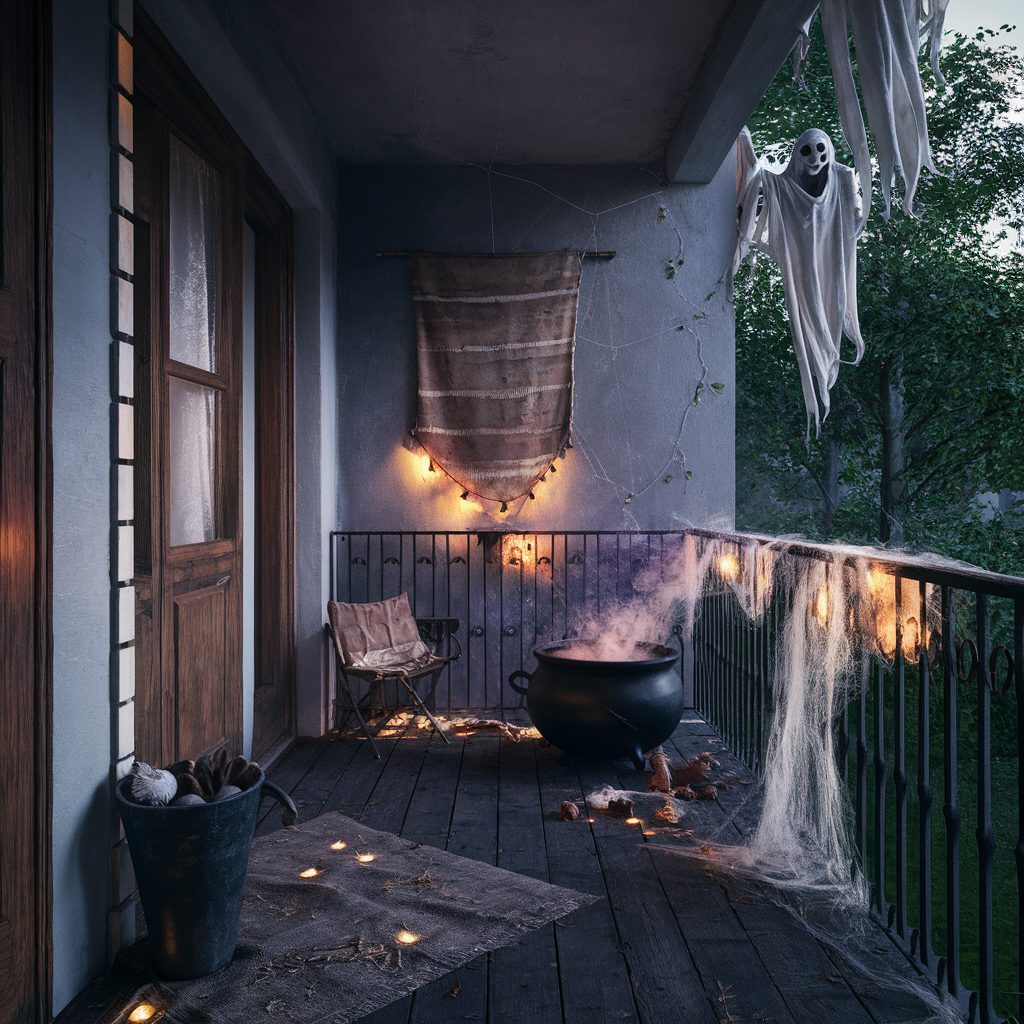 This combination of lighting, sound, and strategically placed decor will give your balcony a deeply eerie vibe that’s just as chilling in the daylight as it is at night.