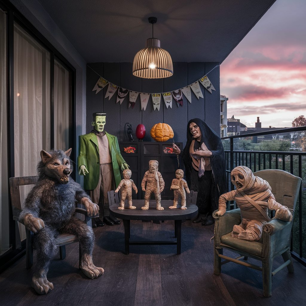 Unleash a monster squad on your balcony with Halloween decorations that are both terrifying and fun, creating a thrilling experience for all who visit. Place life-sized figures of classic monsters like werewolves, Frankenstein’s monster, or mummies around the space, positioning them as if they are standing guard, adding a sense of foreboding to the scene. For a more detailed touch, scatter smaller monster figurines along tables or railings, enhancing the theme and filling the space with a variety of creatures.