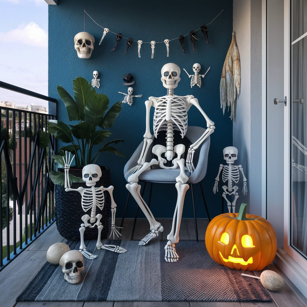 Skeletons are among the most recognizable and eerie symbols of spooky horror, making them perfect for decorating your balcony with a Halloween theme. Place a full-sized human skeleton on a chair, or have it propped up against the railing as if it’s an unsuspecting inhabitant of the balcony.
