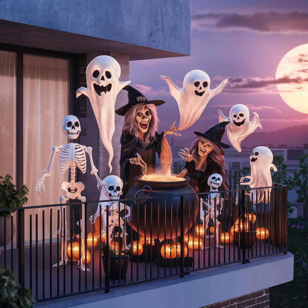 Halloween is the time when spirits come alive, and animated props can truly breathe life into your outdoor balcony decorations. Opt for eerie props like skeletons that seem to crawl out of seats, floating ghosts that drift through the air, and witches with shrieking voices and stirring cauldrons, adding an extra layer of fright to your setup.