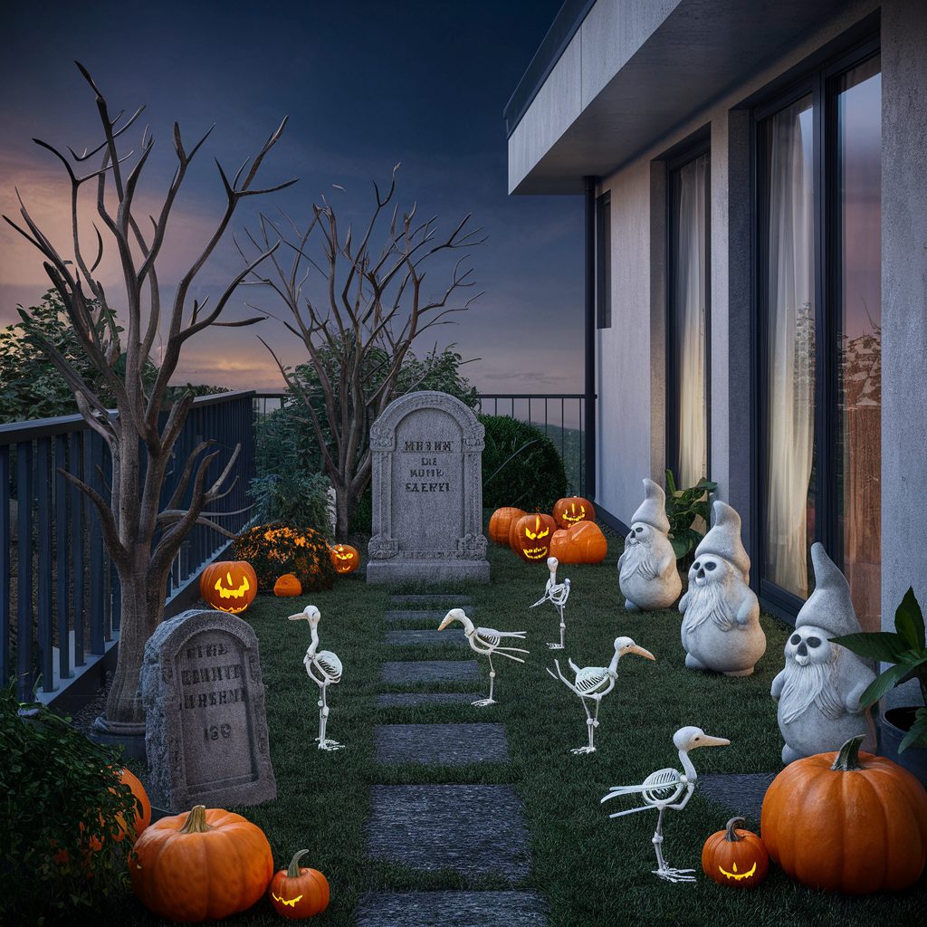 Transform your balcony into a haunting garden with Halloween decorations that blend natural elements with spine-chilling touches. Start by incorporating dried branches and fallen leaves, paired with fake tombstones to create a graveyard atmosphere. Add ghostly garden gnomes, skeletal birds perched on branches, and even skeletons nestled in the foliage for a truly eerie effect.