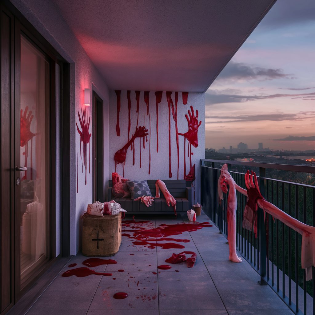 If you’re someone who enjoys taking Halloween decorations to the extreme, adding fake blood and gore is the perfect way to create a truly chilling atmosphere on your balcony. Drip the fake blood down the walls, railings, and even across windows to make it appear as if the space has been overtaken by sinister happenings.