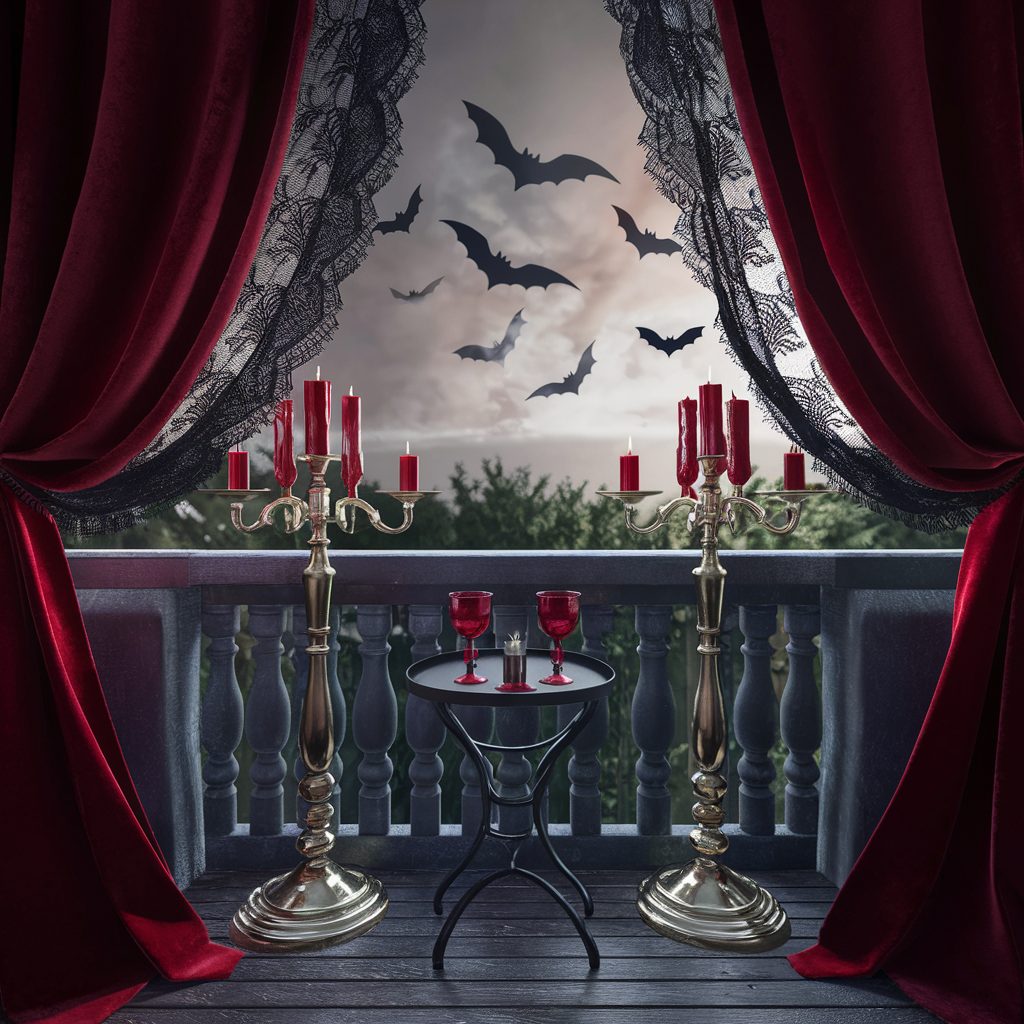 A Bali-style table, draped with a black lace tablecloth and filled with goblets of fake blood, will complete the scene with a chilling touch. Alternatively, consider adding a vampire figure or a bat-themed mural in a prominent spot to capture the essence of a dark, otherworldly atmosphere—ideal for creating the perfect vibe for your own vampire-inspired fashion week.