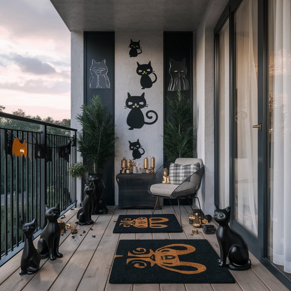 For an added touch, look for a doormat featuring a black cat, or hang a wreath adorned with one on your door, provided there’s enough space. This black cat motif not only ties in beautifully with the Halloween theme but also adds a touch of sophistication and style to your entire balcony décor.