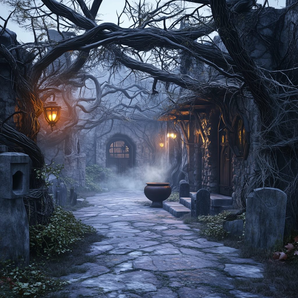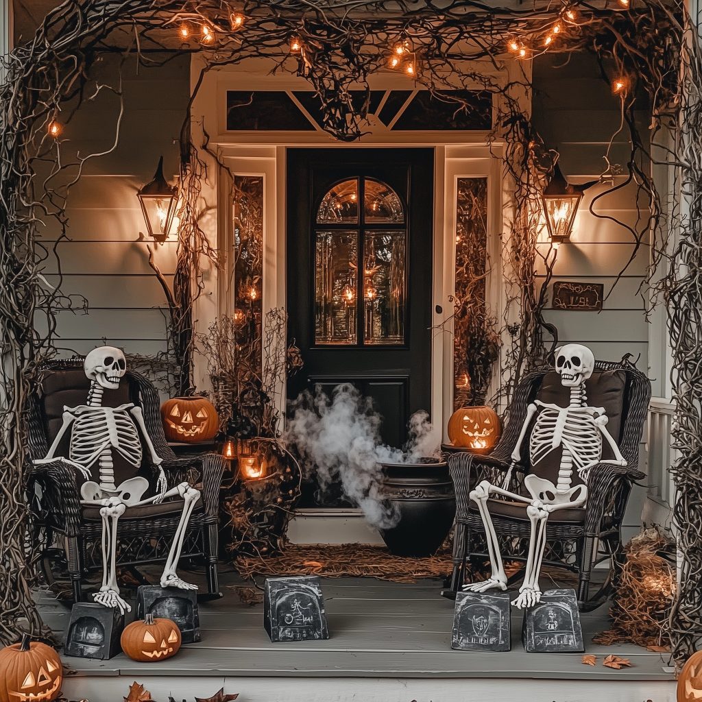 Place stone-like props or faux boulders on either side of the entrance to give the area a more rugged, ancient feel. Right by the door, set up a bubbling cauldron — enhanced with a smoke machine for that dramatic, potion-brewing effect. To add a playful twist, position a few skeletons lounging casually on porch furniture or peeking around corners.