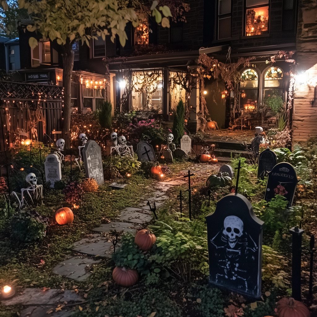 Drape hanging ghosts or skeletons from tree branches, position tombstones along garden paths to mimic an eerie cemetery, and weave string lights through bushes to cast eerie glows and shadows at night. You can even add flickering lanterns or LED candles along the walkway to guide guests through your haunted yard.