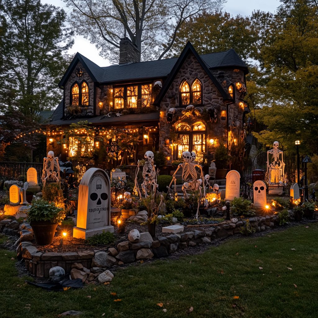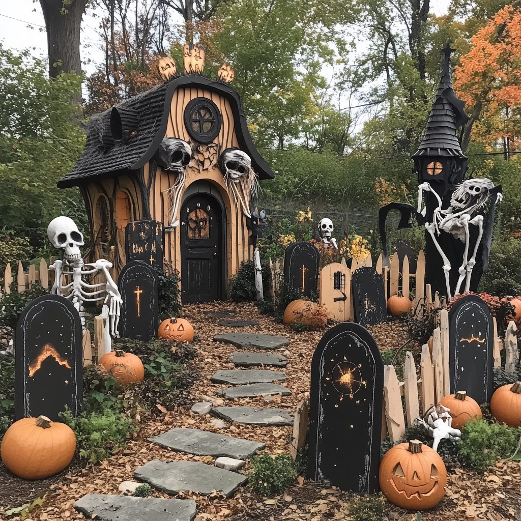 Creating a spooky graveyard in your yard is a classic Halloween tradition that never fails to deliver a haunting effect. Start by arranging tombstones of different shapes and sizes throughout the space, giving it the look of an eerie, long-forgotten cemetery. To add realism, build small mounds of dirt in front of the tombstones to simulate freshly dug graves — a chilling detail that’s sure to get attention.