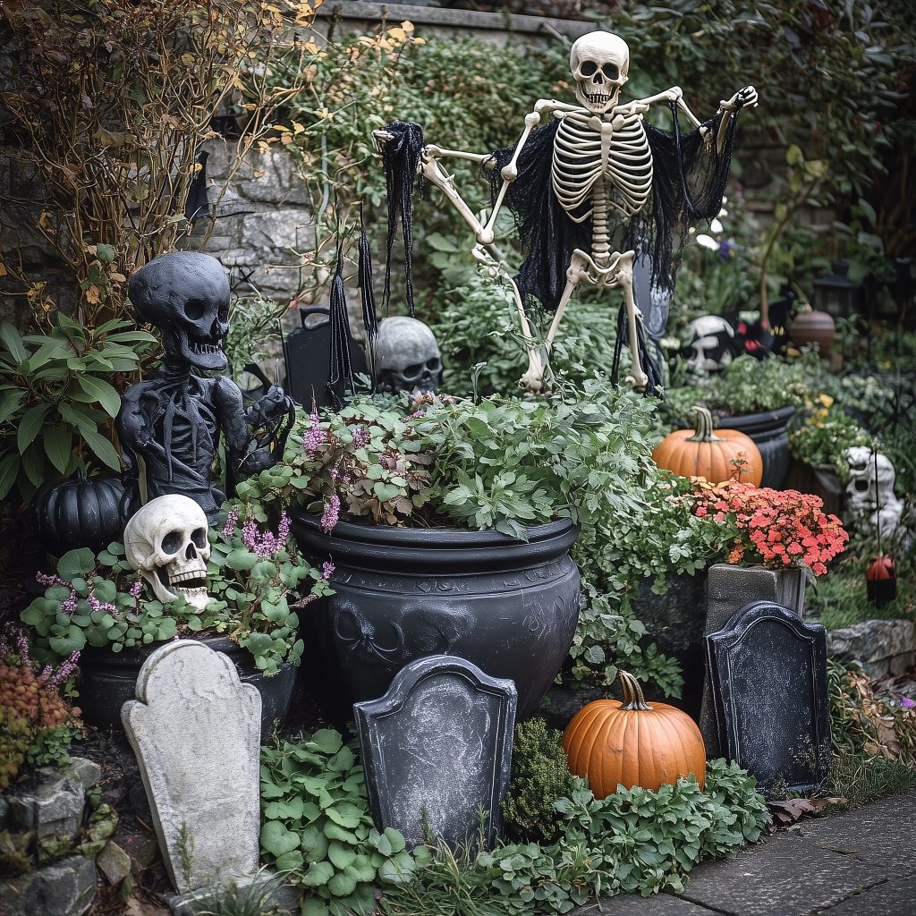 Add faux tombstones among the flowerbeds, hang skeletons from tree branches, and swap out your regular pots for pumpkin-shaped or cauldron-style planters filled with creepy arrangements. You can even drape oversized spider webs across garden trellises or between tall plants to give the space an unnerving, abandoned feel.