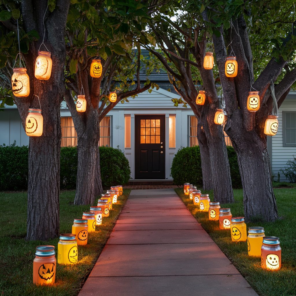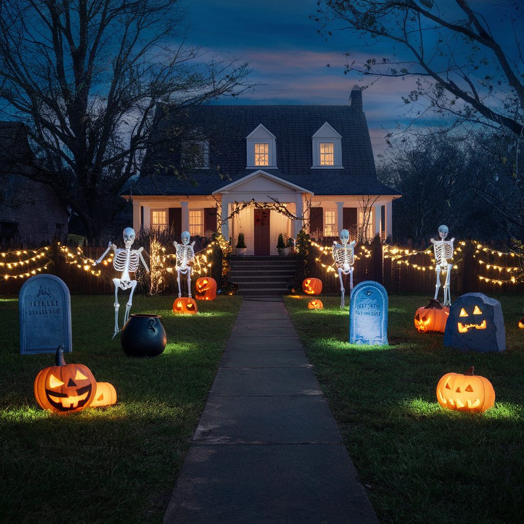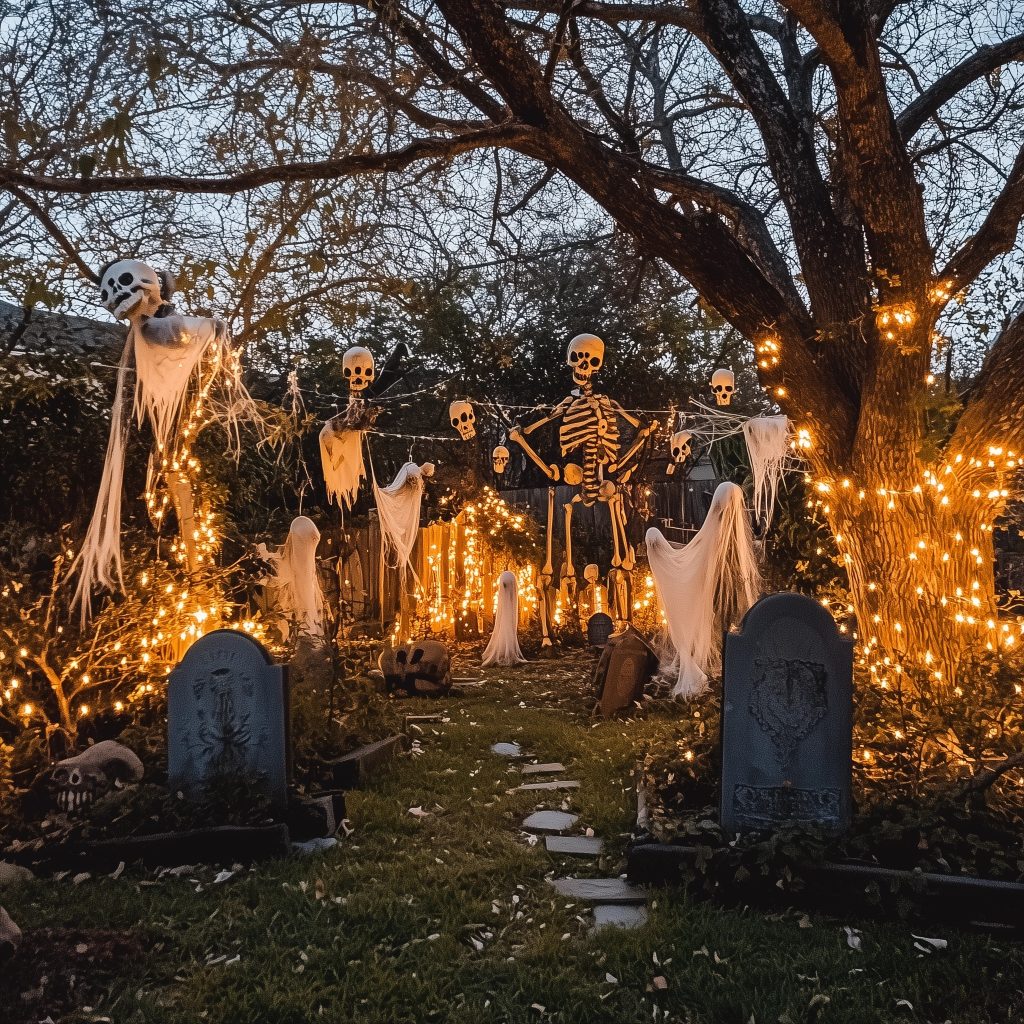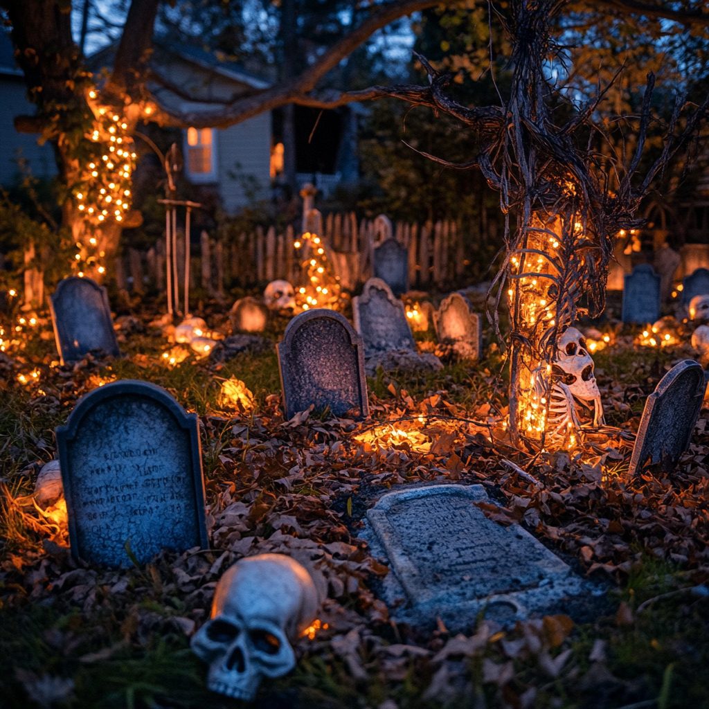 Pathway lighting is essential to guide visitors safely through your yard, reducing the risk of trips or falls — solar-powered or battery-operated lights are great energy-efficient options. String lights and lanterns can be hung along fences, porches, or trees to cast a warm, inviting glow that balances the eerie ambiance.