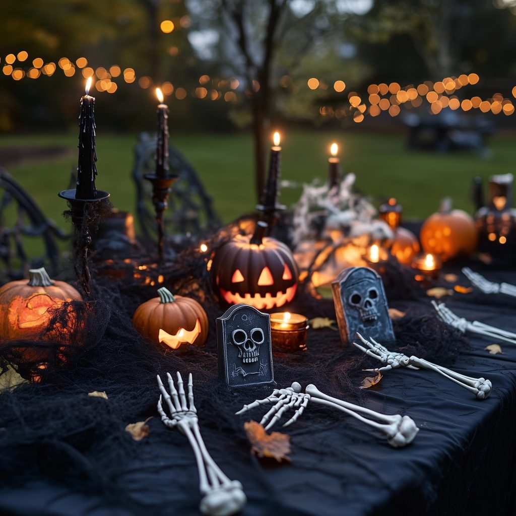 Your outdoor table settings should fully embrace the spooky Halloween theme, enhancing the overall ambiance of your party setup. Start with a dramatic black tablecloth as your base, then layer on themed accessories like utensils shaped like skeleton hands and candle holders styled to look like tombstones or miniature cauldrons.