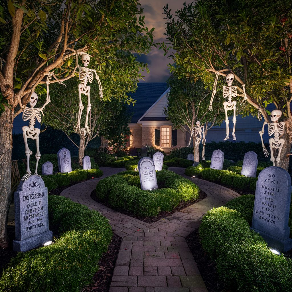 Scatter gnarled branches and dried leaves across the ground to evoke a sense of decay and age, deepening the creepy atmosphere. For an even more dramatic touch, pose skeletons near the graves — some half-buried, others emerging — to enhance the story your graveyard tells.