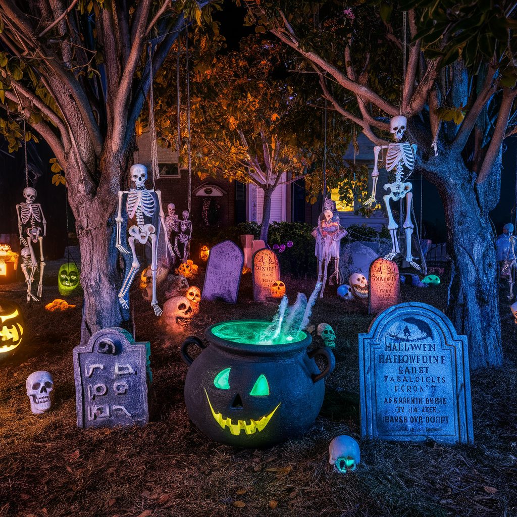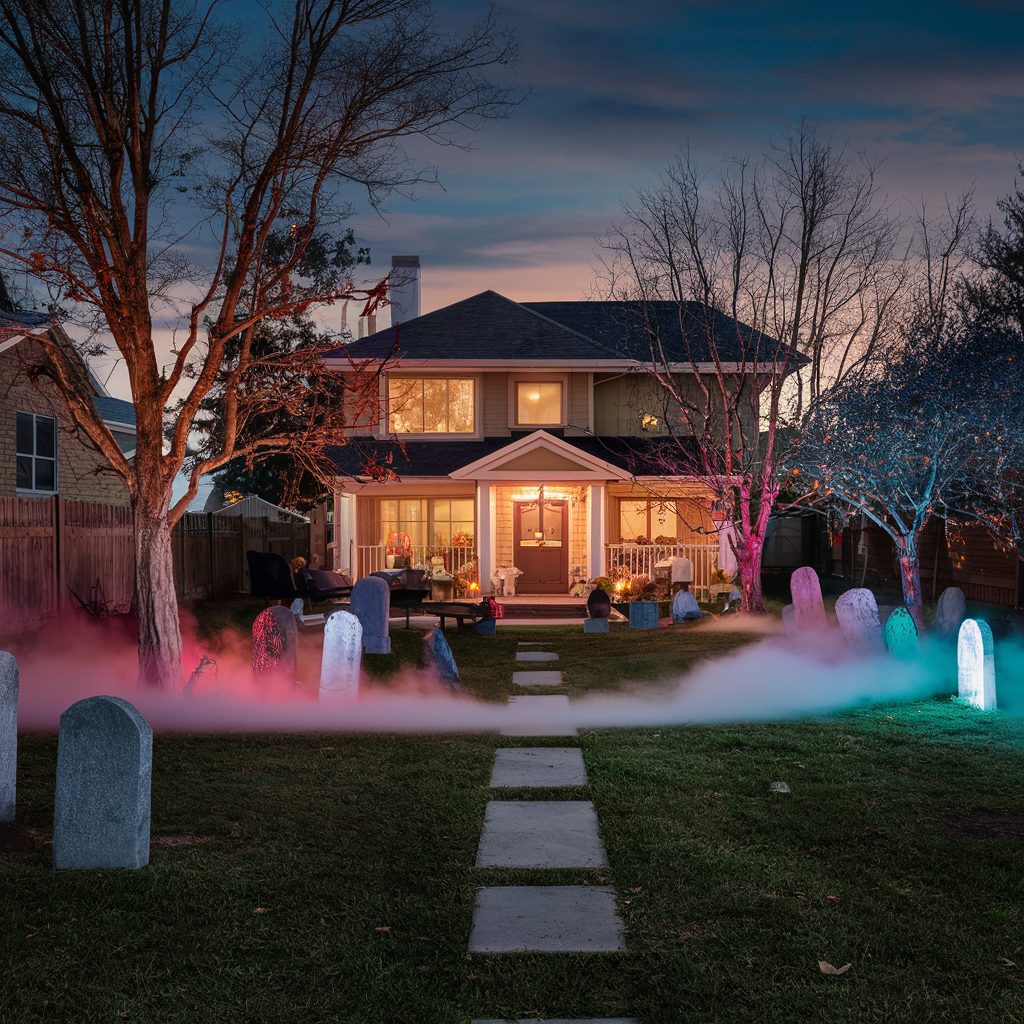 This low-lying fog helps amplify the spooky effect of your other decorations, making skeletons, gravestones, and creepy props appear as though they’re emerging from another world. For maximum impact, pair the fog with multi-colored lighting — for example, green or purple lights that cut through the mist to create a ghostly, otherworldly glow.