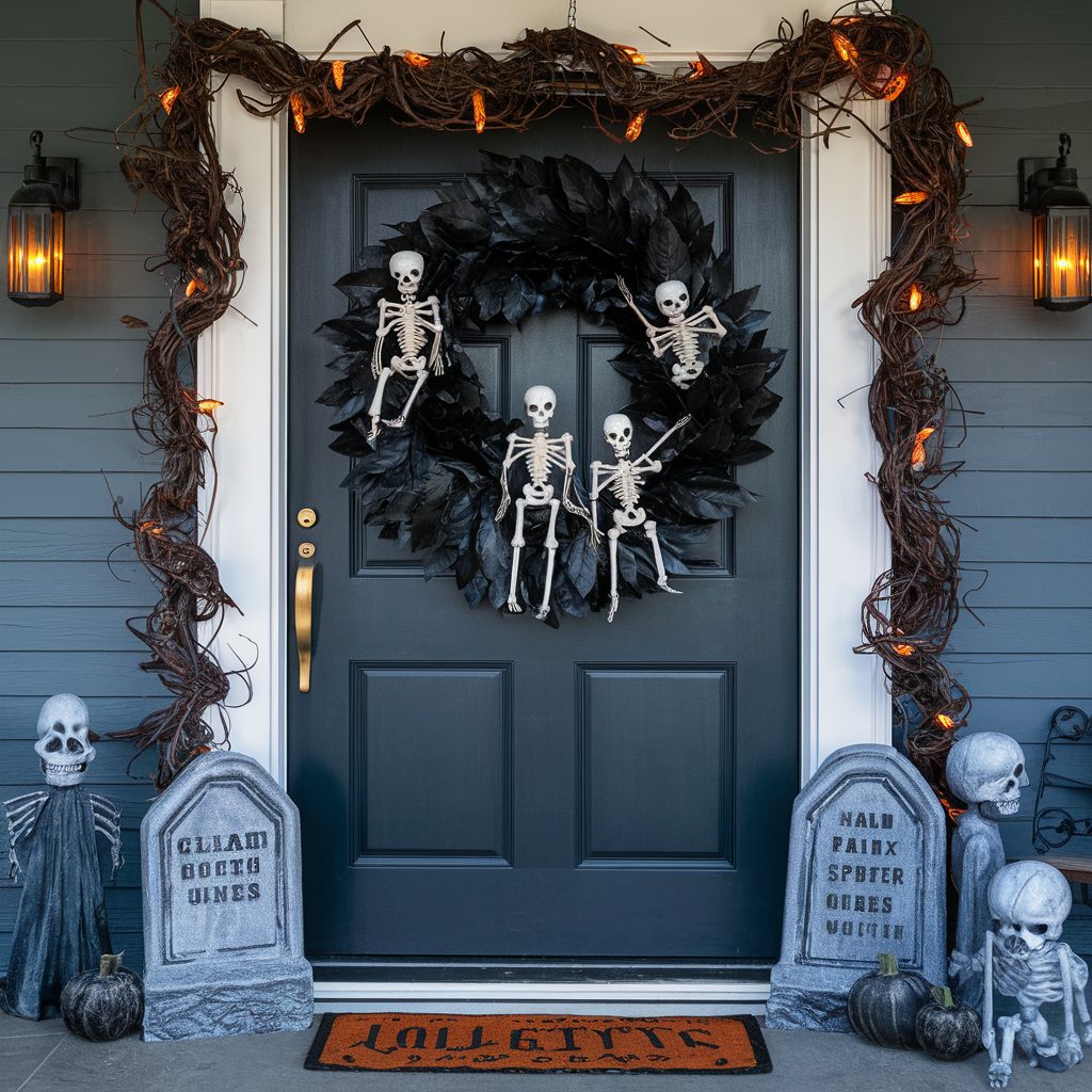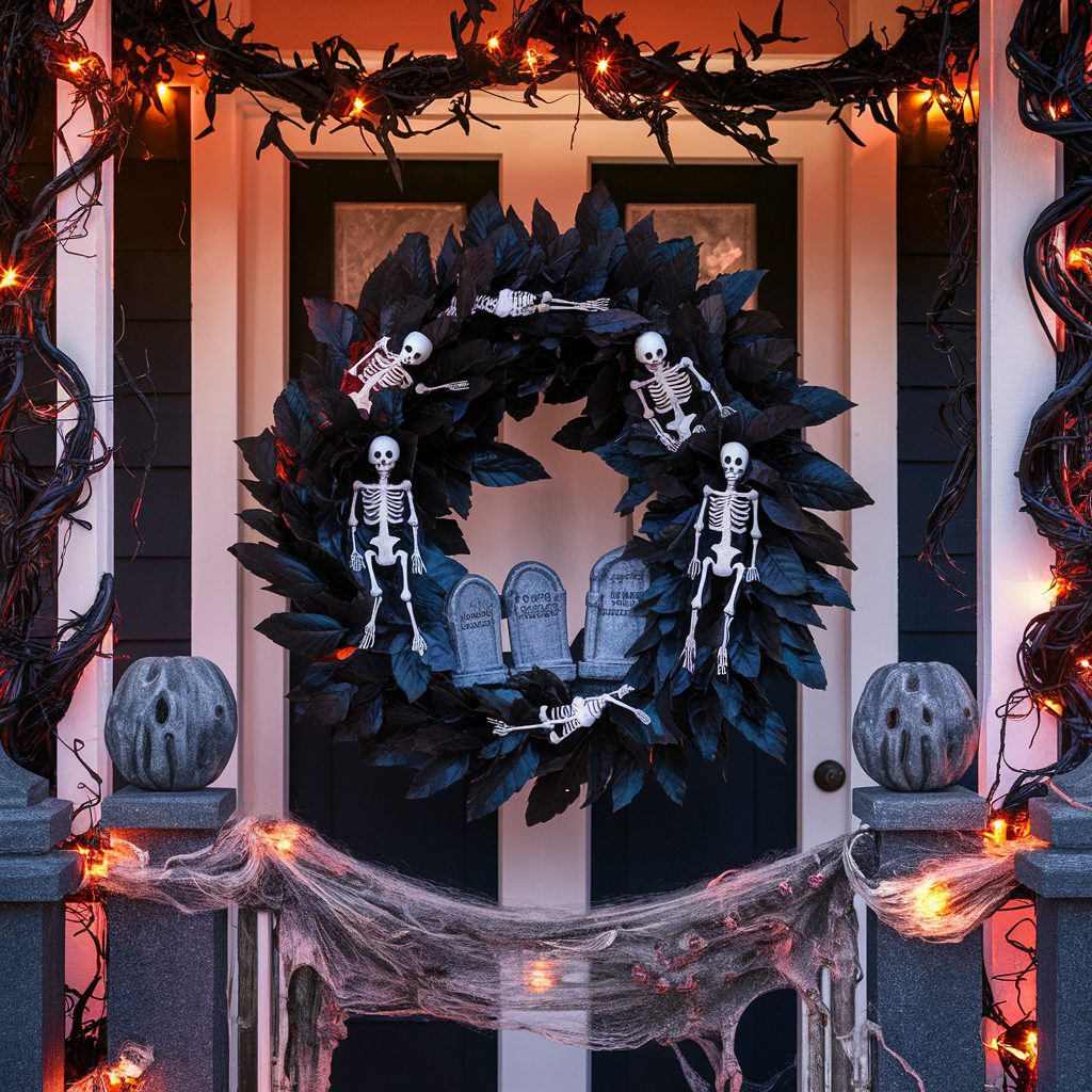 Wreaths and garlands are timeless decor staples that can be creatively transformed to match the spooky charm of Halloween. Craft a Halloween-themed wreath for your porch using materials like black faux leaves, miniature skeletons, tiny tombstones, or even small jack-o’-lanterns.
