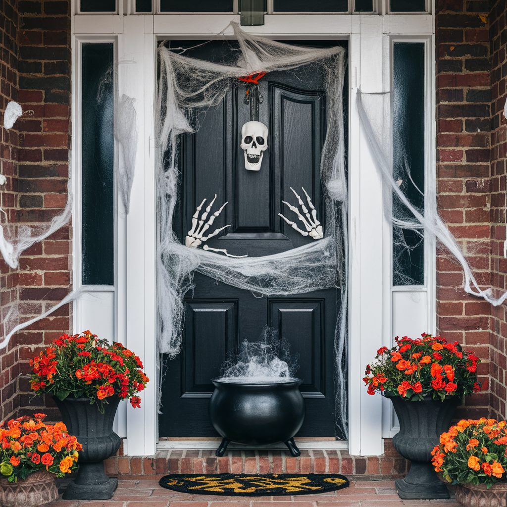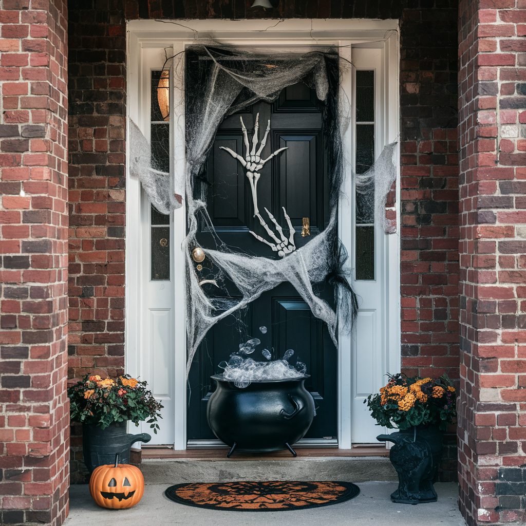 For an extra touch of fright, attach skeletal hands reaching out from the door or walls, as if something sinister is trying to escape. Set a smoking cauldron nearby, using a fog machine to create a mysterious mist that spills out onto the steps. This kind of front door decor makes a bold first impression and draws guests straight into the spooky spirit of Halloween.