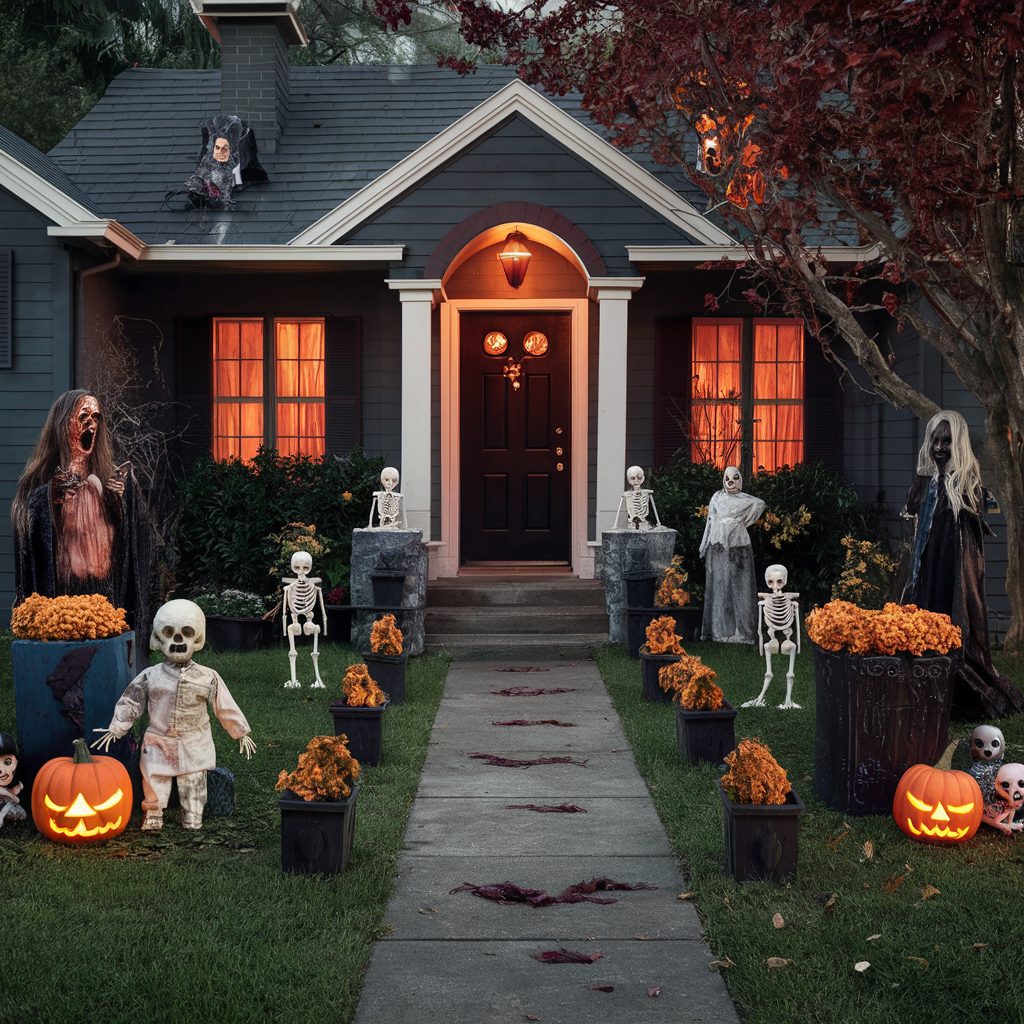 Spread tombstones unevenly across the lawn to mimic an overgrown graveyard, and don’t forget to fill your planters with bizarre, unsettling plants — think twisted branches, black flowers, or even fake carnivorous greenery. Enhance the entire setup with strategically placed lighting that casts dramatic shadows and makes the whole scene look like a long-abandoned, haunted property.