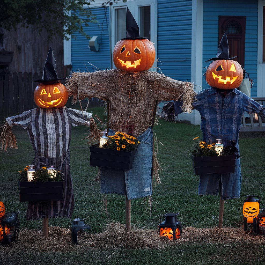 Give them an eerie personality by adding torn gloves, crooked hats, or even glowing eyes. Place them strategically around your yard — perhaps guarding a pathway, peering out from behind trees, or sitting ominously on the porch. For added effect, have them hold accessories like lanterns emitting ghostly light or planters filled with black or blood-red flowers.