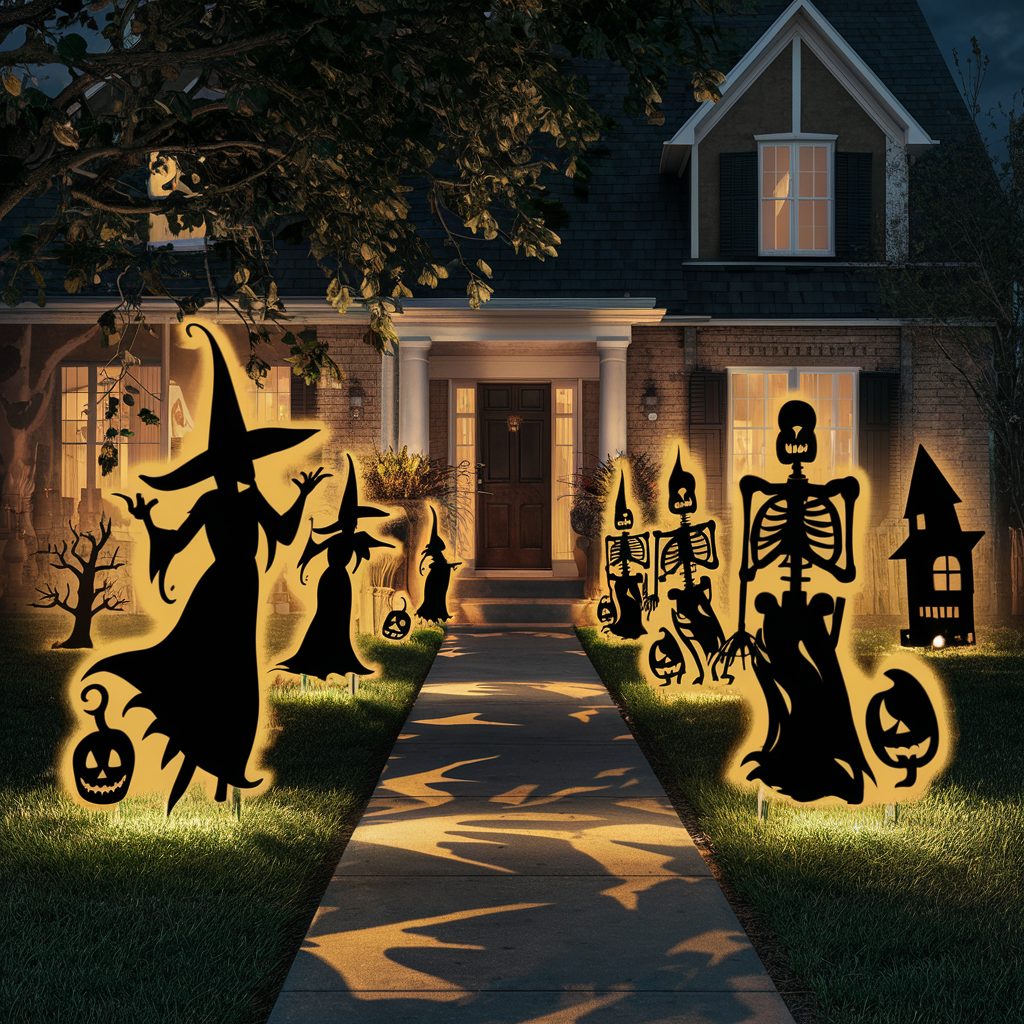 Position spotlights or floodlights at the right angles so these shapes cast long, chilling shadows across your home or garden. As visitors walk by, the flickering shadows create the illusion of movement, adding a dramatic, haunting effect to your display. This simple yet artistic technique brings a sense of dark enchantment to your Halloween yard, making it both sophisticated and spine-tingling.
