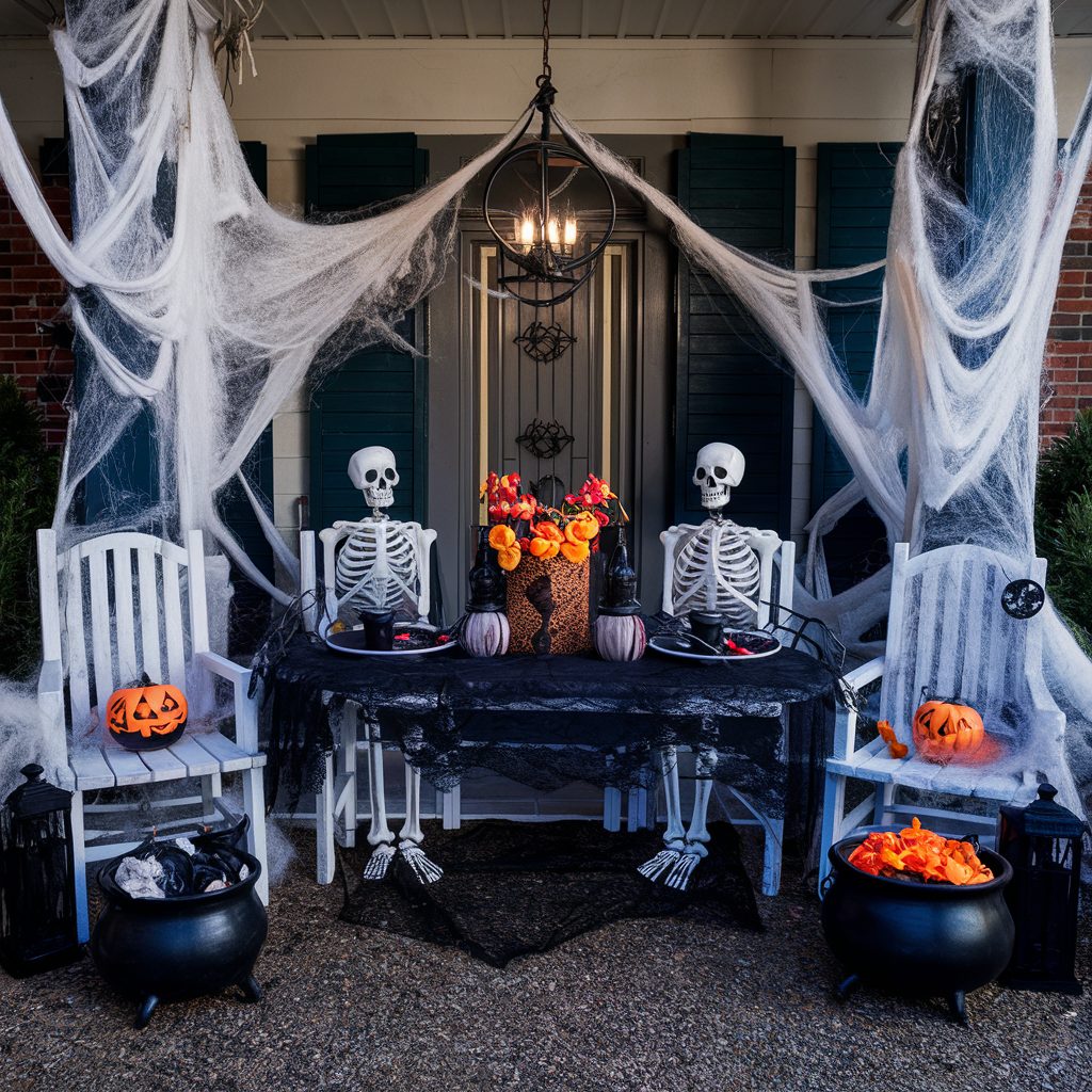 Your outdoor furniture can play a key role in enhancing your Halloween decor, so don’t let it go unnoticed. Transform your seating and dining areas into part of the haunted scene by covering tables and chairs with creepy fabrics like black lace, faux cobwebs, or even tattered cloth.