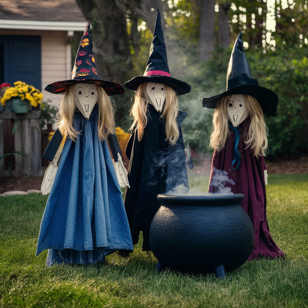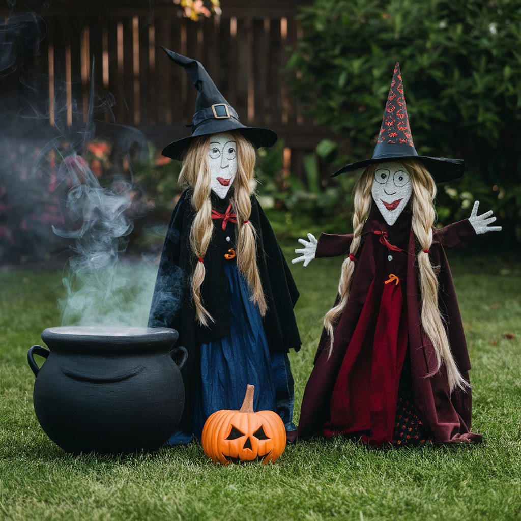 This setup adds both visual interest and a touch of the macabre. It’s the perfect concept for anyone who enjoys DIY projects and wants to infuse their yard with supernatural charm. Not only do these handmade witches elevate your Halloween theme, but they also showcase your creative spirit in a truly enchanting way.