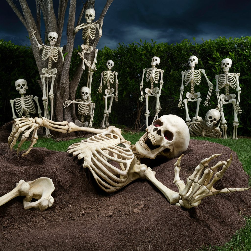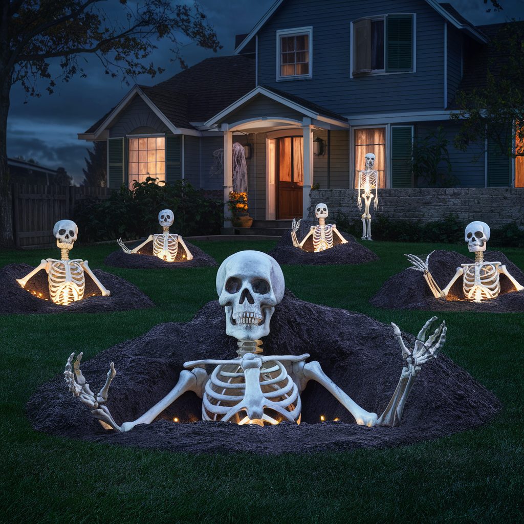 No Halloween yard setup feels fully complete without the classic and chilling presence of skeletons. These timeless decorations are incredibly versatile and can be styled in countless ways to suit both humorous and haunting themes. You might choose to pose them in comical positions—like lounging in lawn chairs or playing musical instruments—or take a creepier route by staging them to appear as though they’re clawing their way out of makeshift graves.