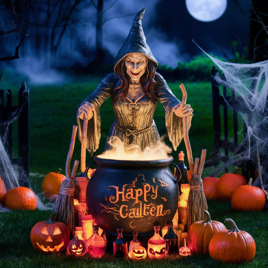 Add a few strategically placed witch figures throughout the yard, with at least one positioned over a bubbling cauldron to create a scene that feels alive and magical. To elevate the creep factor, introduce ghost-like decorations that sway eerily with the wind—these off-centered, floating forms not only draw the eye but also add motion and unpredictability to your display.