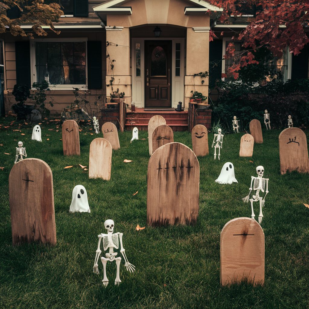 For instance, you can craft custom gravestones using reclaimed wooden planks, giving them a weathered, authentic look, and scatter ghost and skeleton props around the lawn for added fright. What’s great about this approach is that it’s incredibly budget-friendly—you’re saving money while still having the freedom to choose materials you love and customize them to fit your vision.