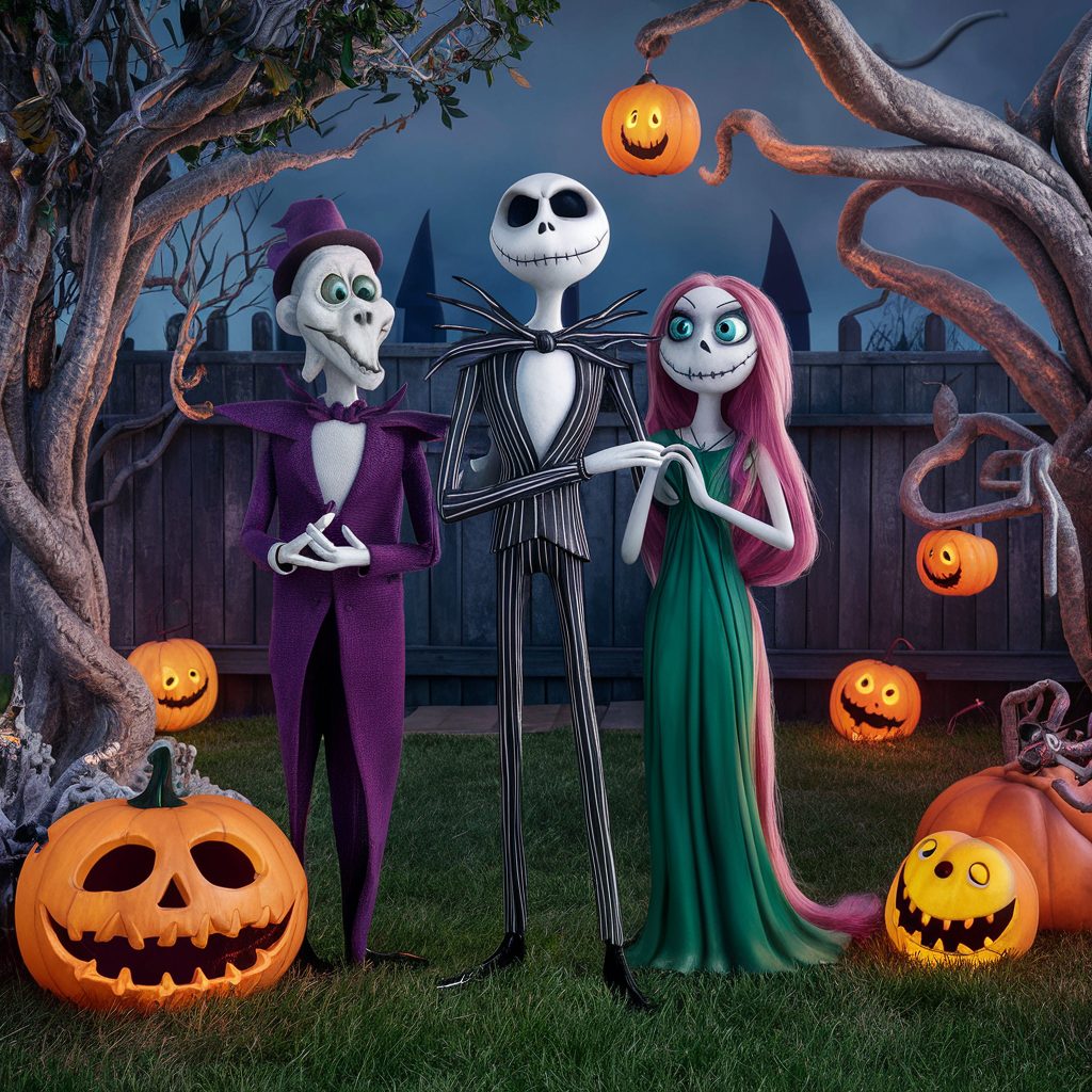 It allows you to tap into both holidays’ aesthetics in one unforgettable display. Begin by placing life-sized figures of iconic characters like Jack Skellington, Sally, and Oogie Boogie throughout your yard to serve as eye-catching centerpieces. Accentuate the theme with twisted, stylized trees and carved pumpkin lanterns that emit an otherworldly glow.