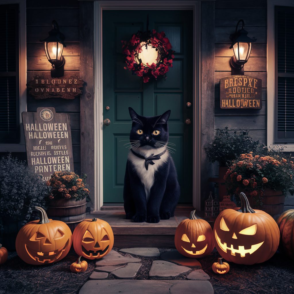 Think about traditional icons like silhouetted black cats with arched backs, intricately carved jack-o’-lanterns, and antique-style lanterns flickering softly at dusk. Add to the ambiance with wooden signs painted in retro fonts, or craft a faux graveyard using aged-looking tombstones that mimic styles from the early 20th century.