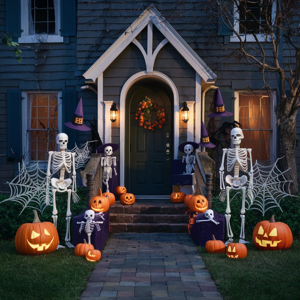 These simple pieces, when thoughtfully arranged, can come together to form a cohesive and spooky outdoor setup that grabs attention. Focus on key areas like your front entrance, walkway, or porch to make the most impact. You can hang webs across bushes, place skeletons near the steps, and scatter witch hats for a fun thematic touch.