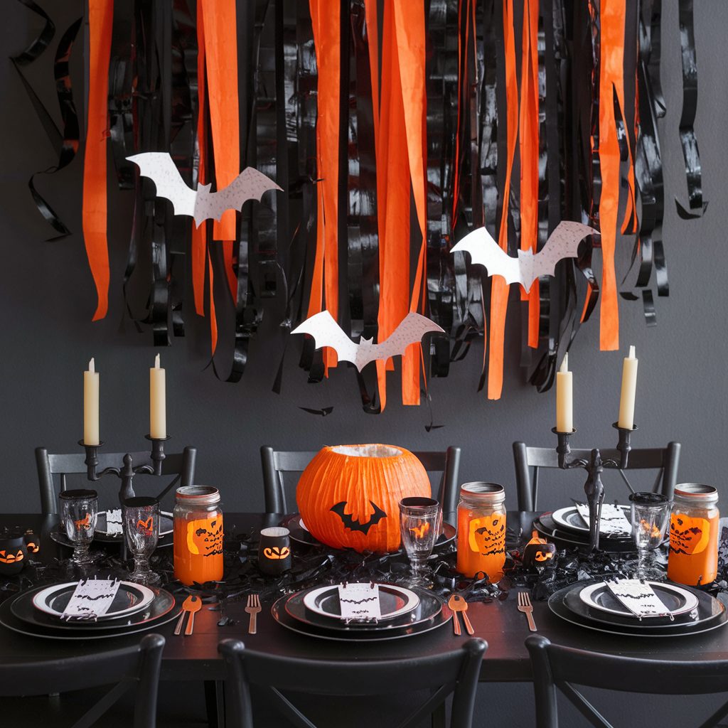 Hang black and orange streamers to set the color tone, craft paper bats for the walls, and stretch inexpensive faux cobwebs across corners and furniture for a chilling effect.