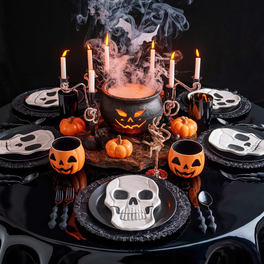 Elevate the place settings with eerie yet stylish accents, such as skull or pumpkin-themed dishes, spider web placemats, and elegant black or gold cutlery for a refined touch. For centerpieces, think creatively: vintage candle holders with dripping candles, miniature jack-o’-lanterns, or a decorative cauldron bubbling with dry ice can all make a haunting impact.