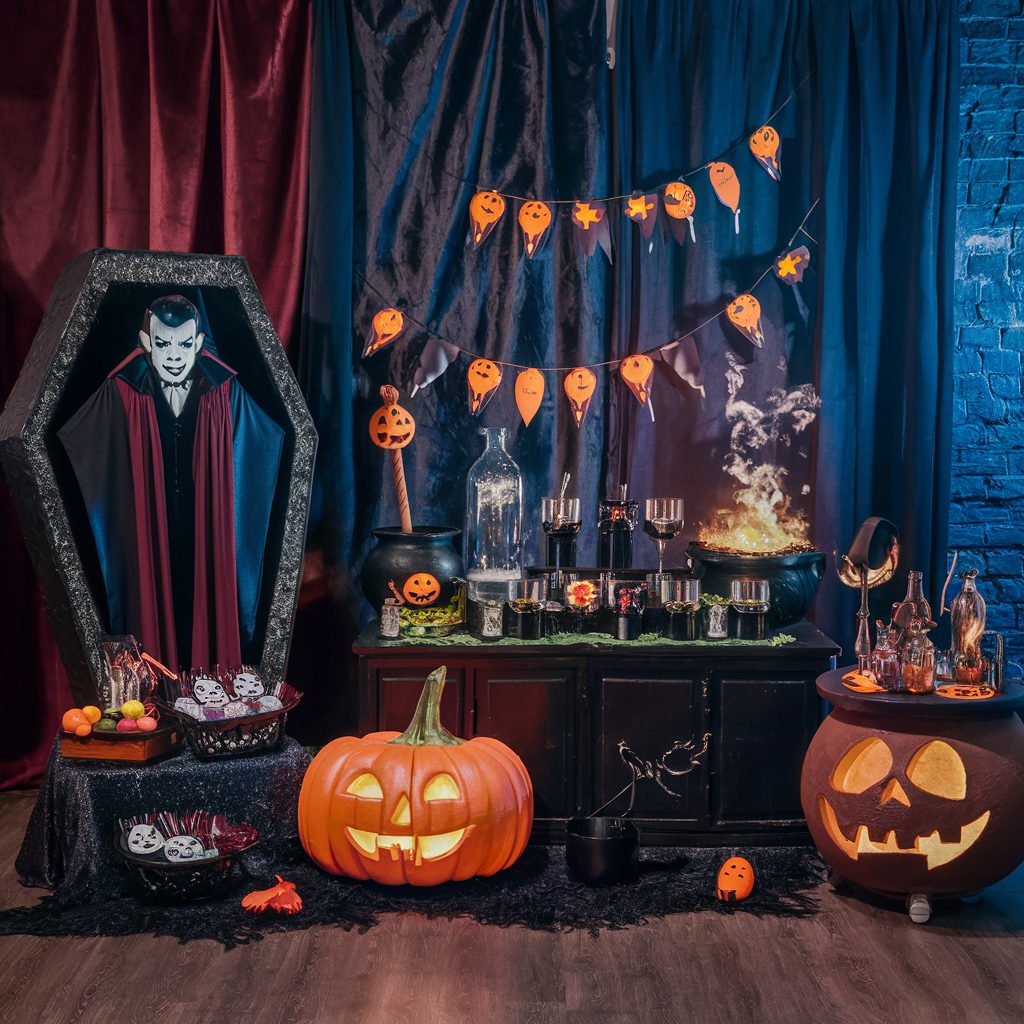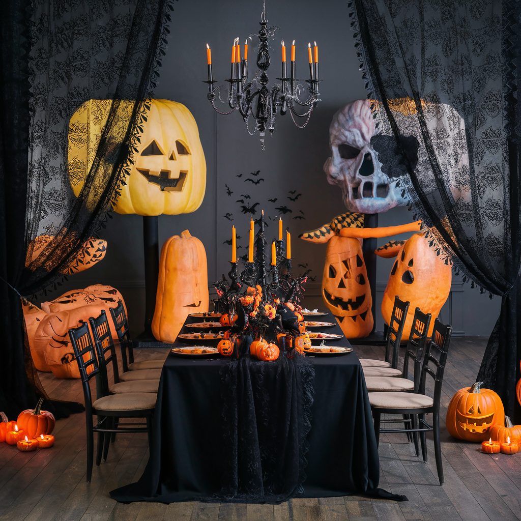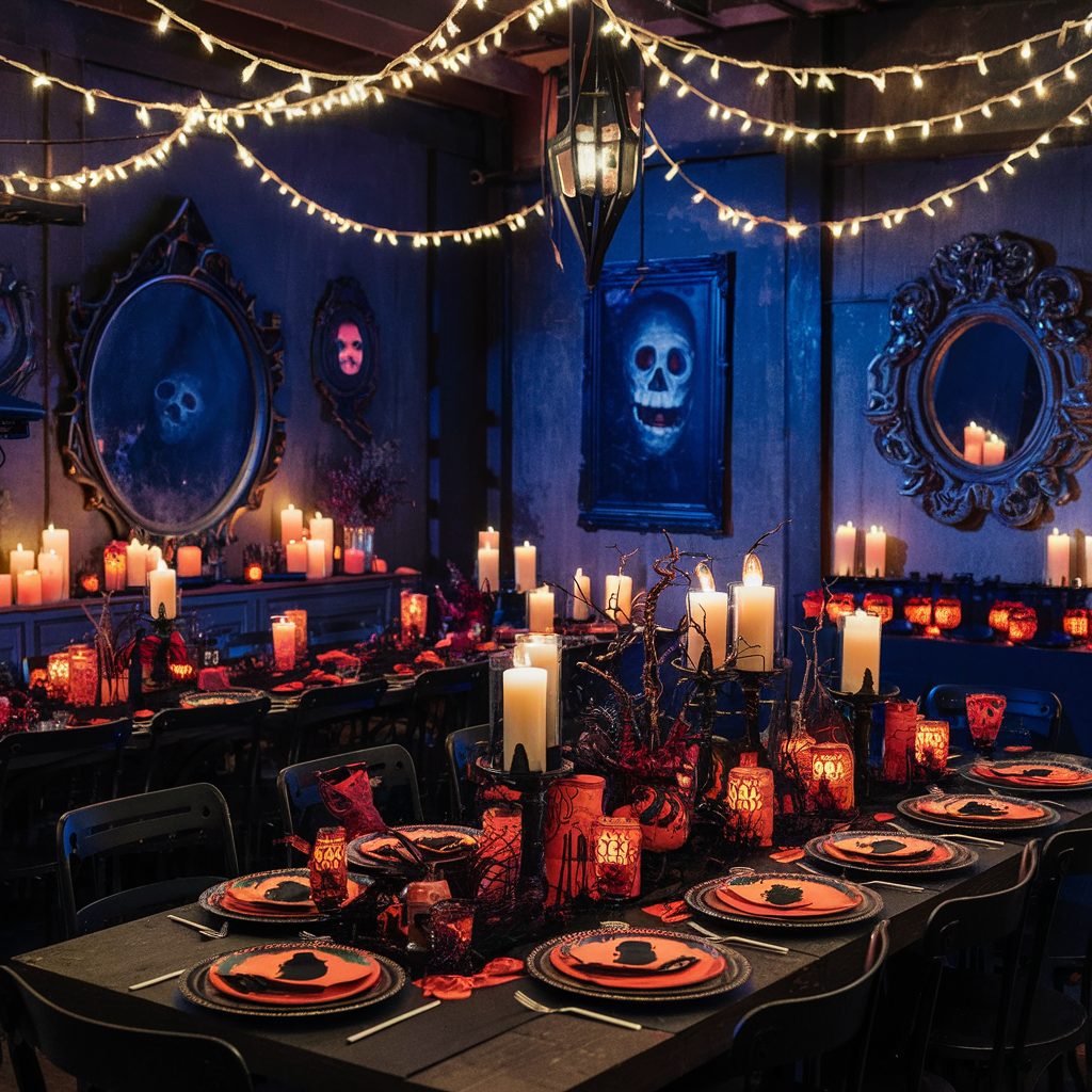 Whether you’re hosting an intimate gathering or a large-scale Halloween bash, decorations play a crucial role in setting the mood and elevating the experience. For smaller, private events, opt for detailed yet eerie touches like black lace curtains, flickering candles, and a dining table set with themed dinnerware and spooky accents to create an immersive atmosphere.
