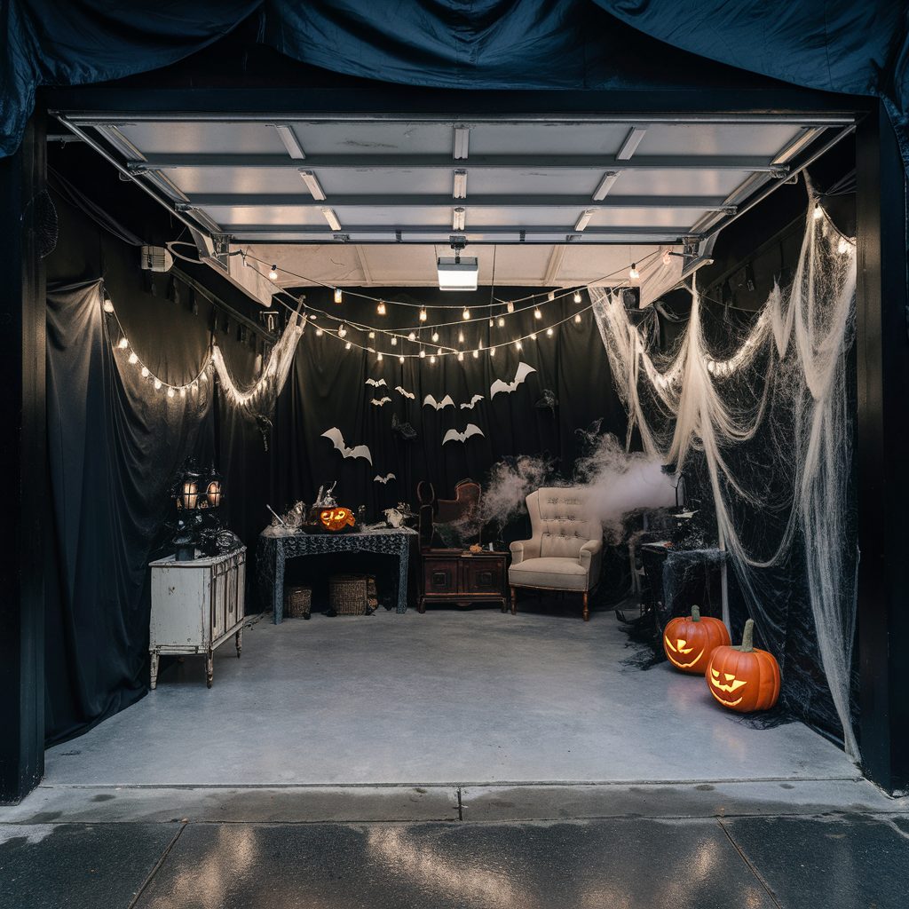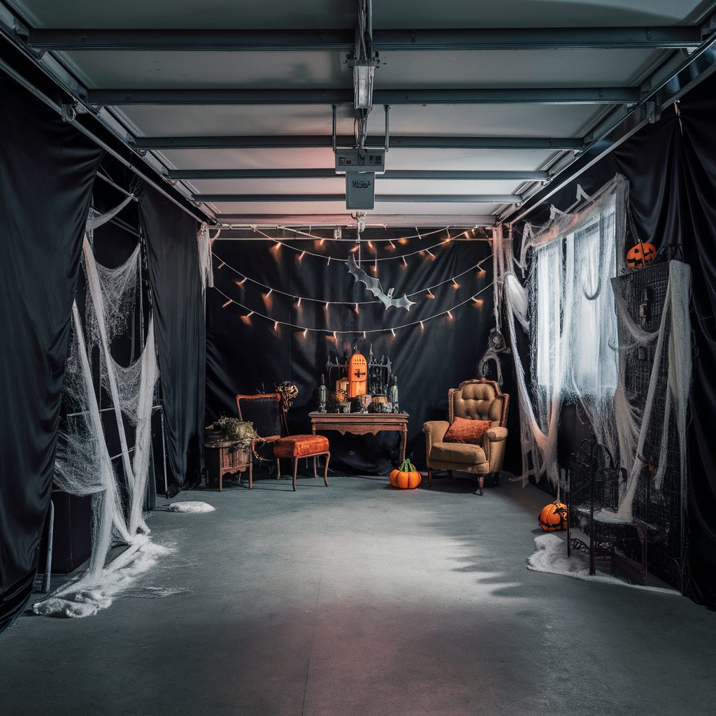 Transforming a garage into a spooky Halloween party venue requires a mix of creativity and resourcefulness. Start by draping the walls with black fabric or even black trash bags to instantly darken the space and create a chilling, enclosed feel. Add string lights, faux cobwebs, and hanging bats to intensify the haunted house effect.