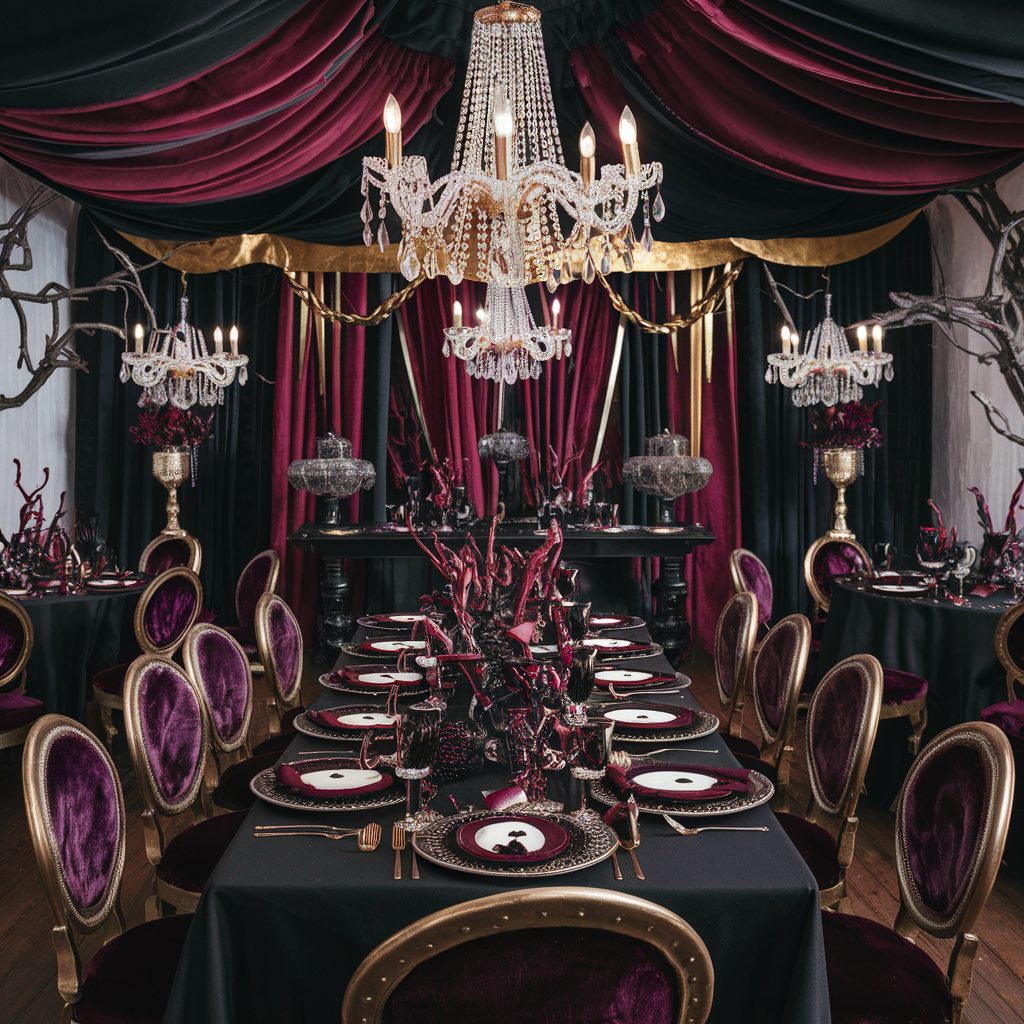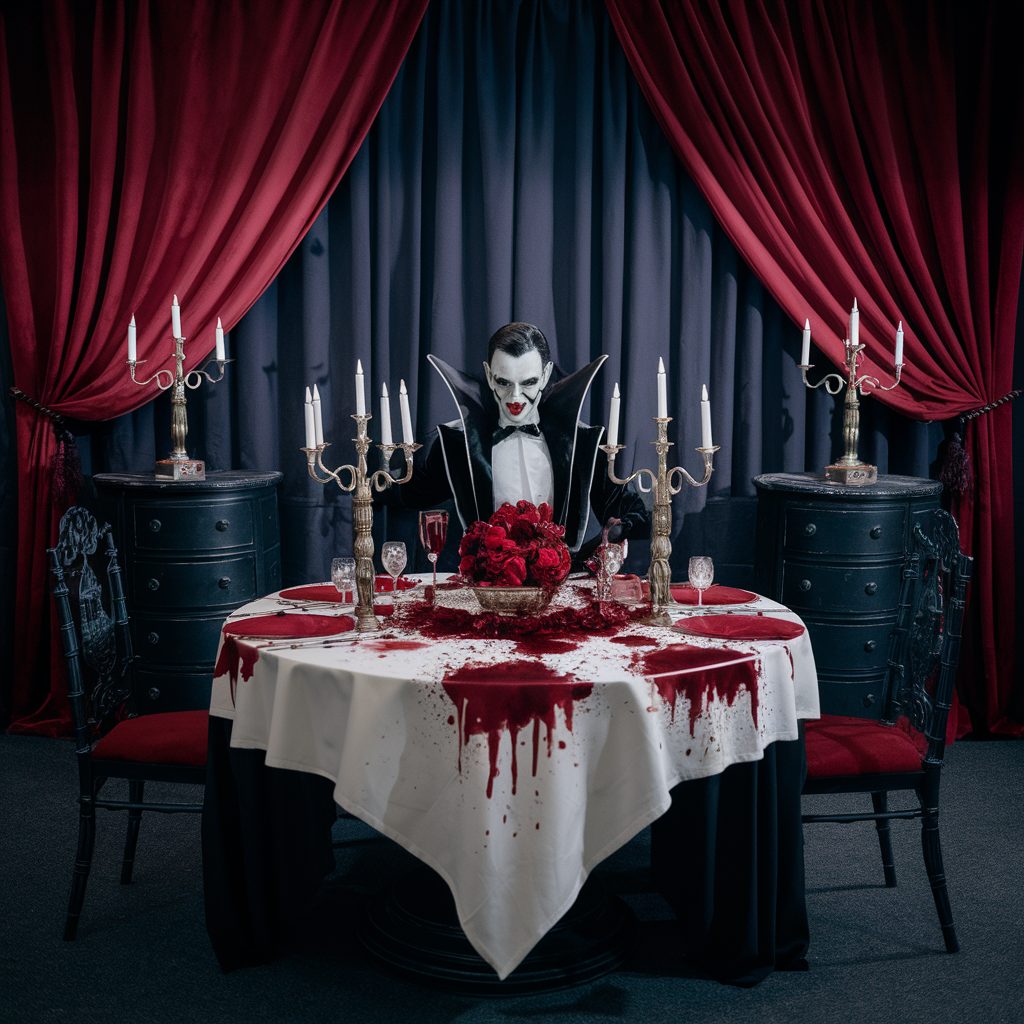 A vampire-themed Halloween party offers the perfect blend of eerie elegance and theatrical horror, creating a luxurious yet spine-chilling atmosphere. To set the mood, envision an interior draped in rich red velvet curtains, dimly lit with ornate candlesticks that cast flickering shadows across the room. Incorporate dark and dramatic elements like gothic-style mirrors, plush black or burgundy furnishings, and white tablecloths stained with faux blood for added effect.