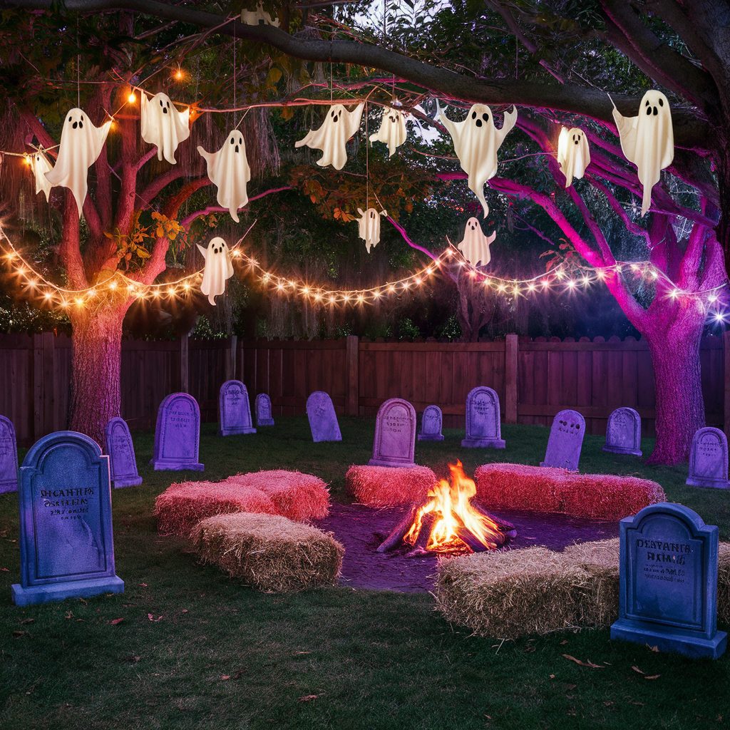If your yard allows, setting up a cozy bonfire area with hay bales for seating adds not only a rustic touch but also an eerie charm that enhances the overall mood.