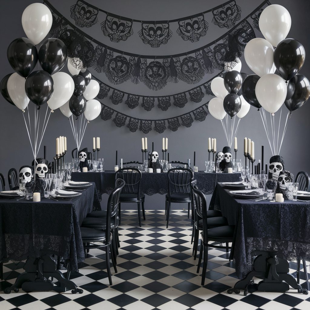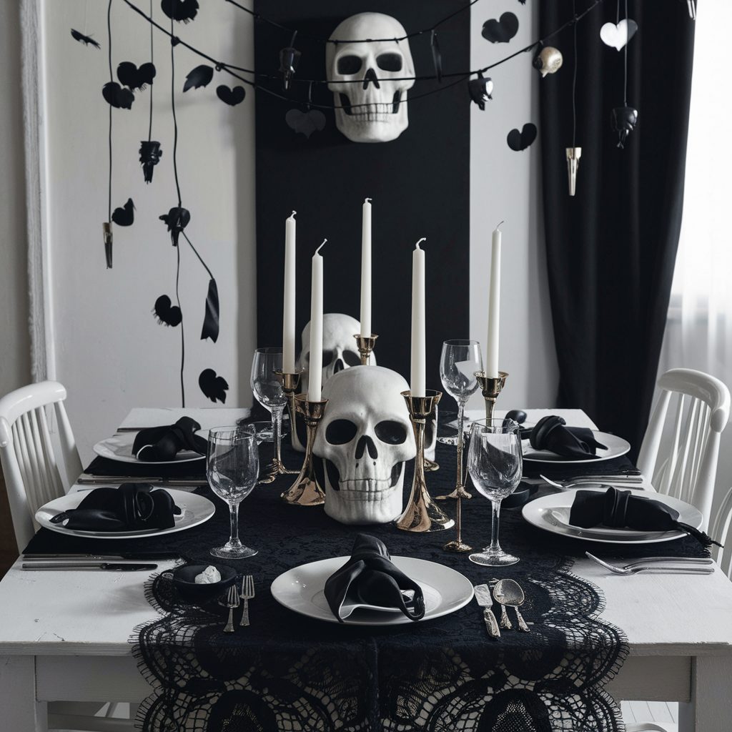 To strike the perfect balance between eerie and elegant, incorporate tasteful pieces such as black lace tablecloths, sleek matte candle holders, and decorative skull figurines that serve more as art than fright.