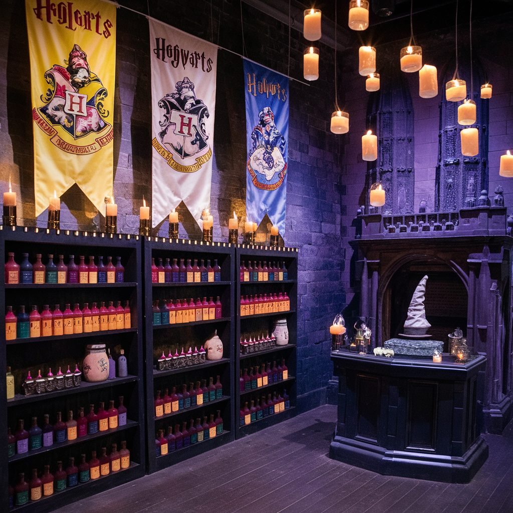 Enhance the experience with decorative potion bottles, vintage-style spell books, and iconic wands placed throughout the room. Incorporate magical creatures like Dobby, Hedwig, or even a miniature Buckbeak as themed decor pieces to delight your guests.