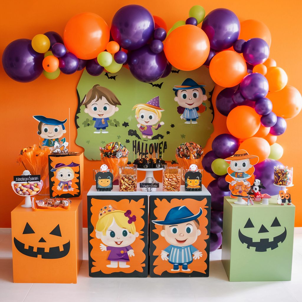 When planning a Halloween party for children, the focus should be on fun, vibrant colors, and just a touch of gentle spookiness to keep things exciting but not too scary. Use playful decor like balloons in bright orange, purple, and green, paired with cheerful jack-o’-lanterns and smiling ghost figures to create a warm, festive atmosphere.
