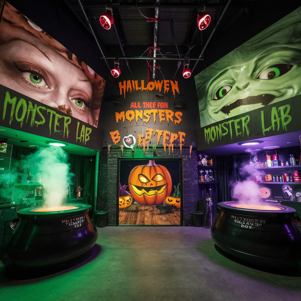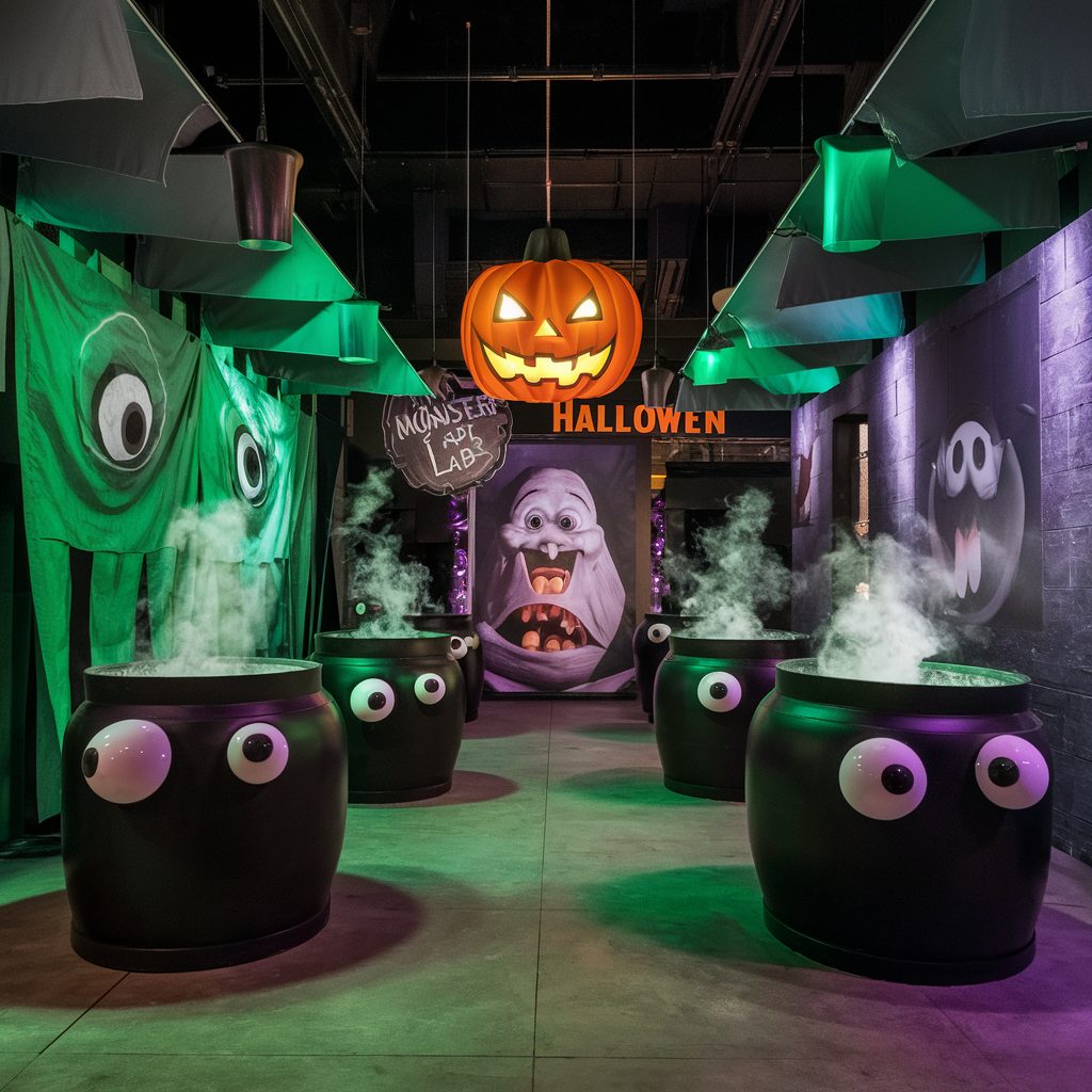 Mix in an assortment of amusing yet eerie props—think mismatched monster arms, goofy fangs, and furry textures—to keep the mood lighthearted. Set the tone with glowing green and purple lighting to create a fun, otherworldly vibe.