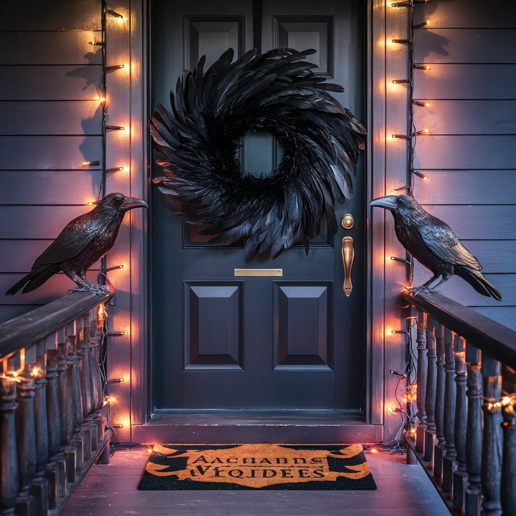 Your front door serves as the focal point of your Halloween porch decor, making it the perfect place to set the tone for your entire theme. It’s the first impression guests and trick-or-treaters will get, so aim for a design that’s bold, creative, and instantly attention-grabbing. Consider accenting the door with unique elements like a nosegay made of black feathers or decorative faux birds to add a mysterious, slightly eerie touch.