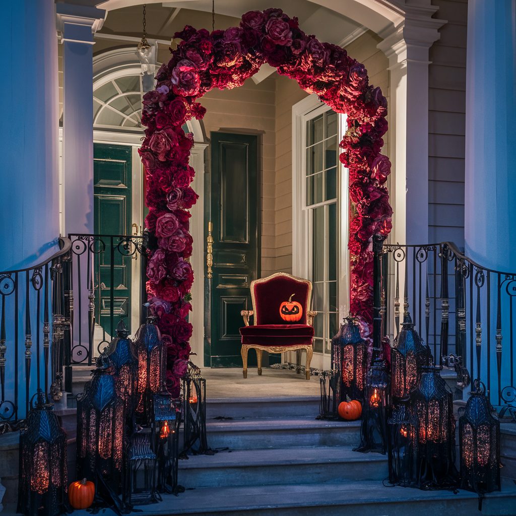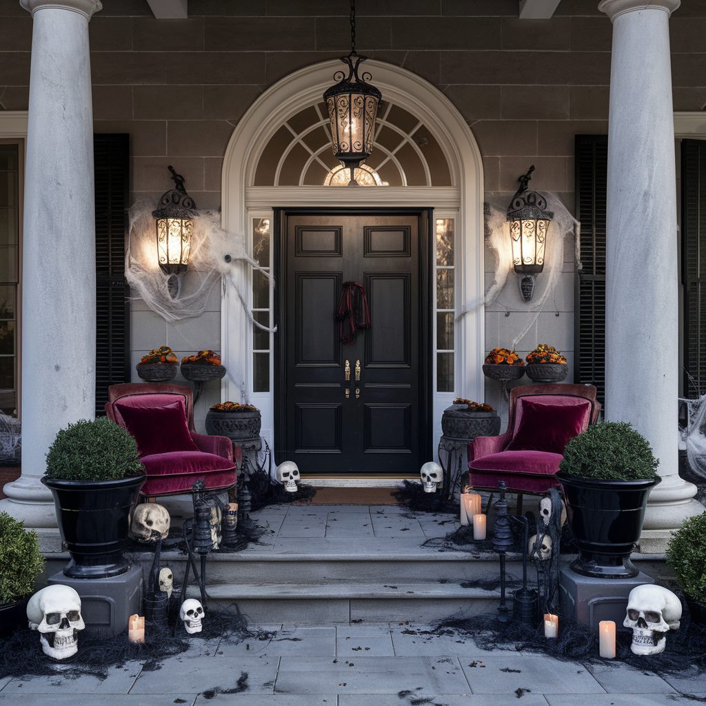 Combining elegance and eeriness in your Halloween porch decor can result in a striking, upscale look that’s both haunting and sophisticated. Start by building a base of refined, stylish elements—think wrought iron lanterns, plush velvet cushions, and sleek black planters—to create a sense of luxury and visual cohesion.