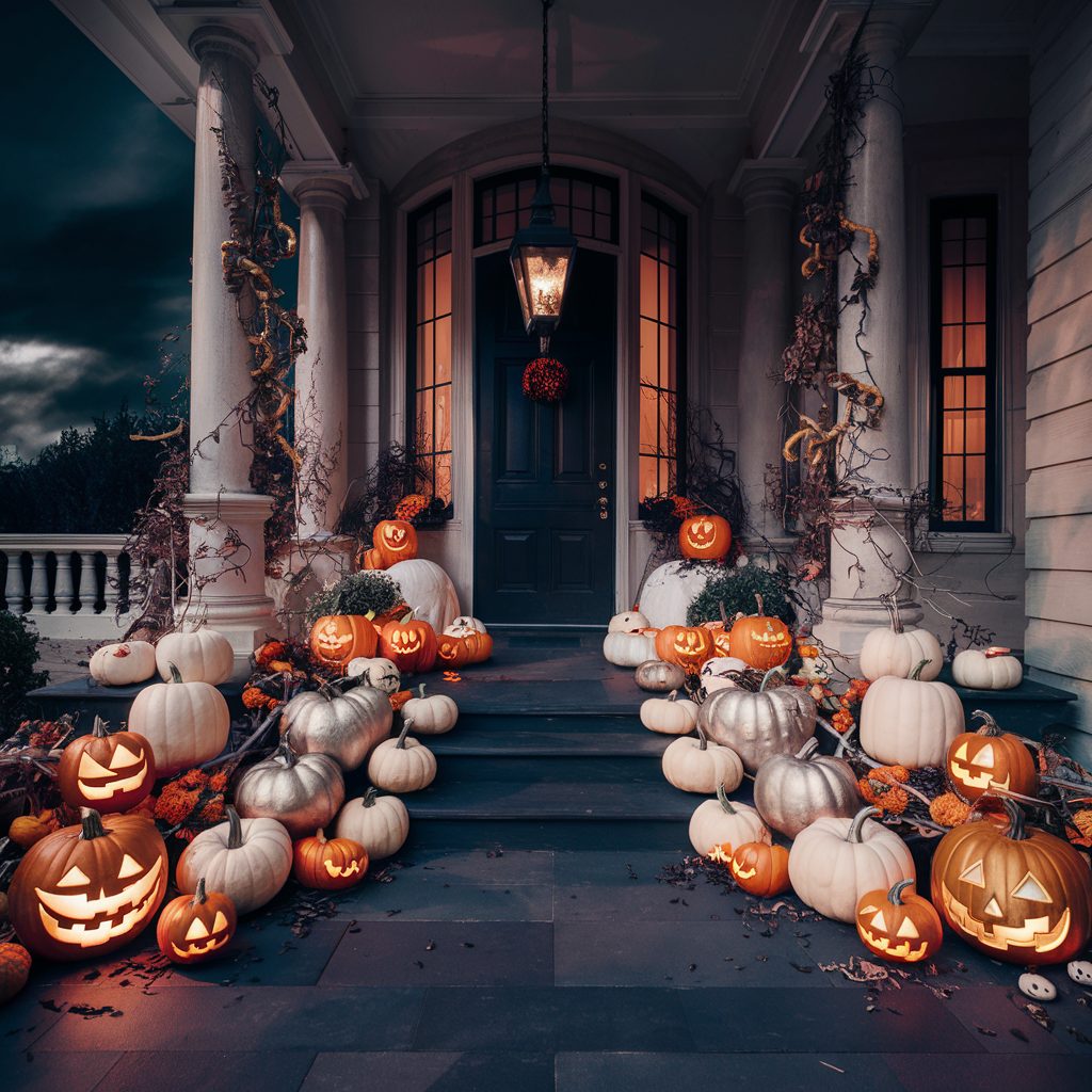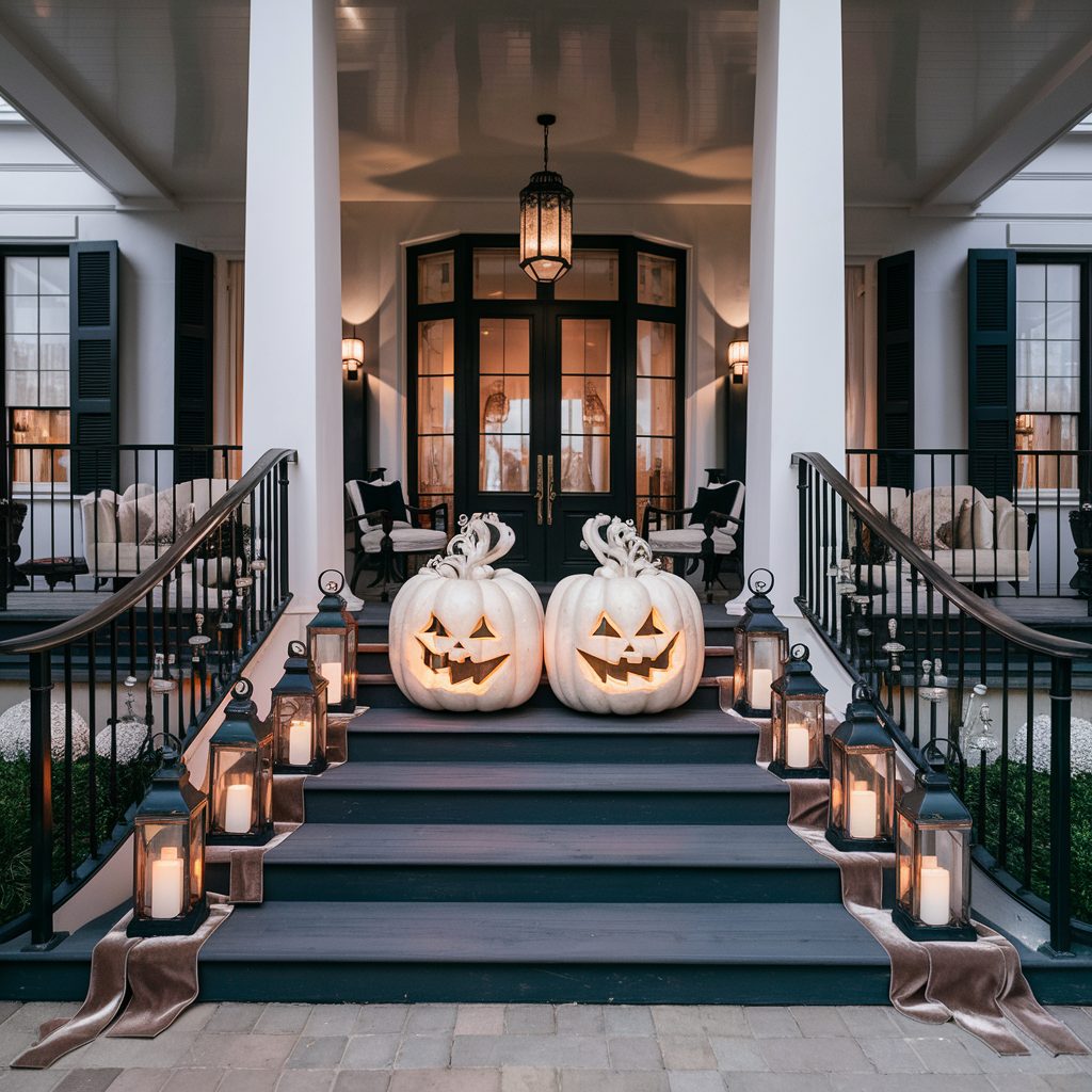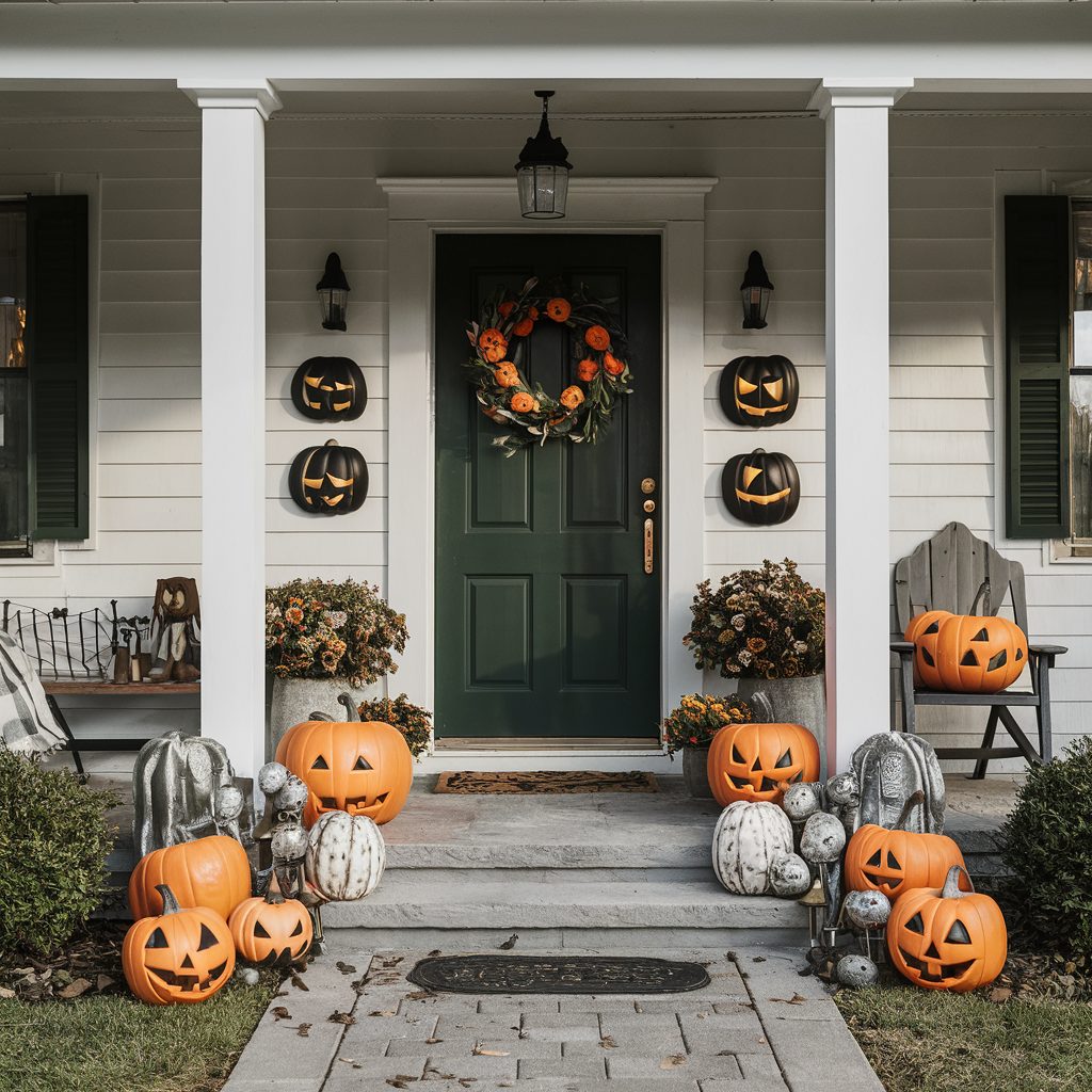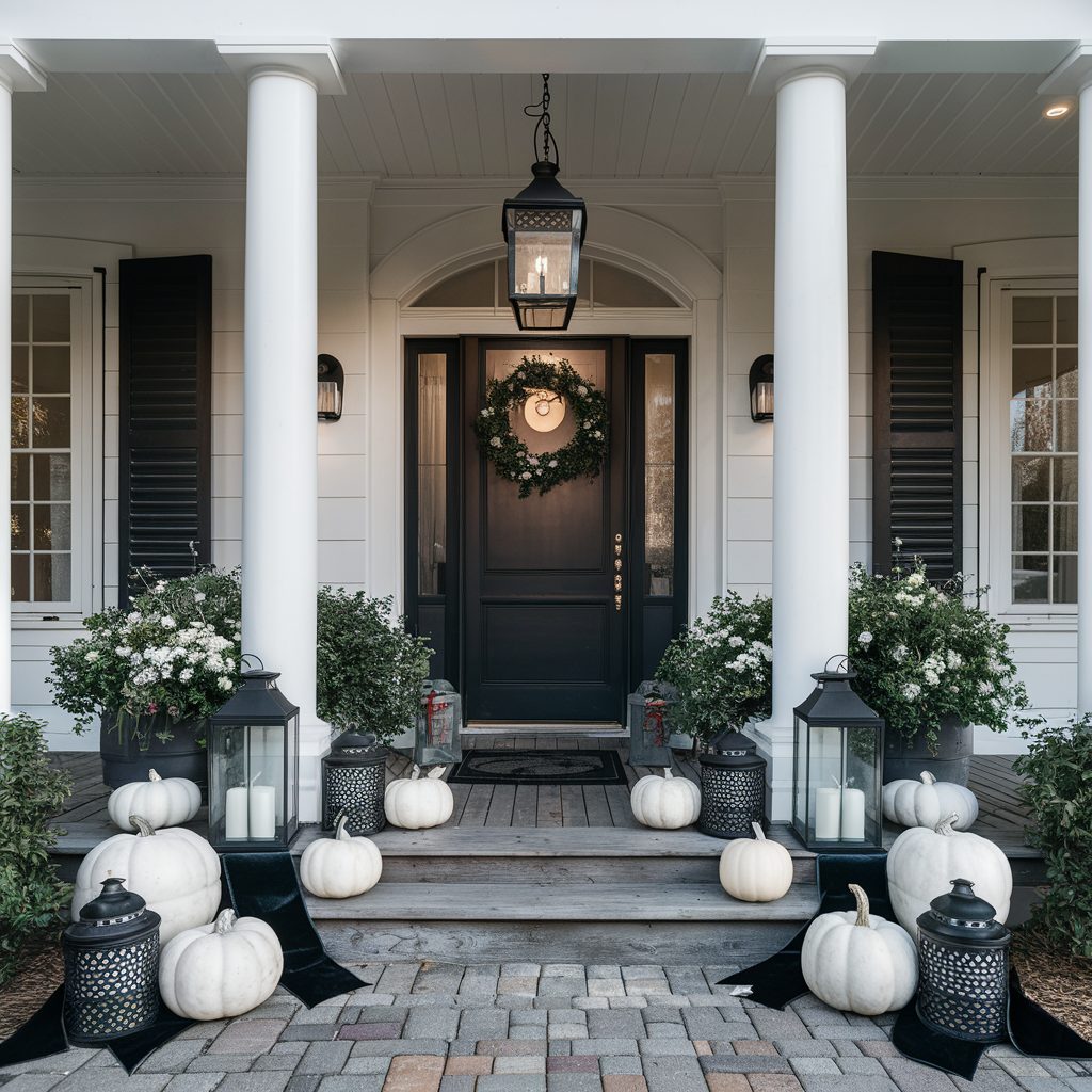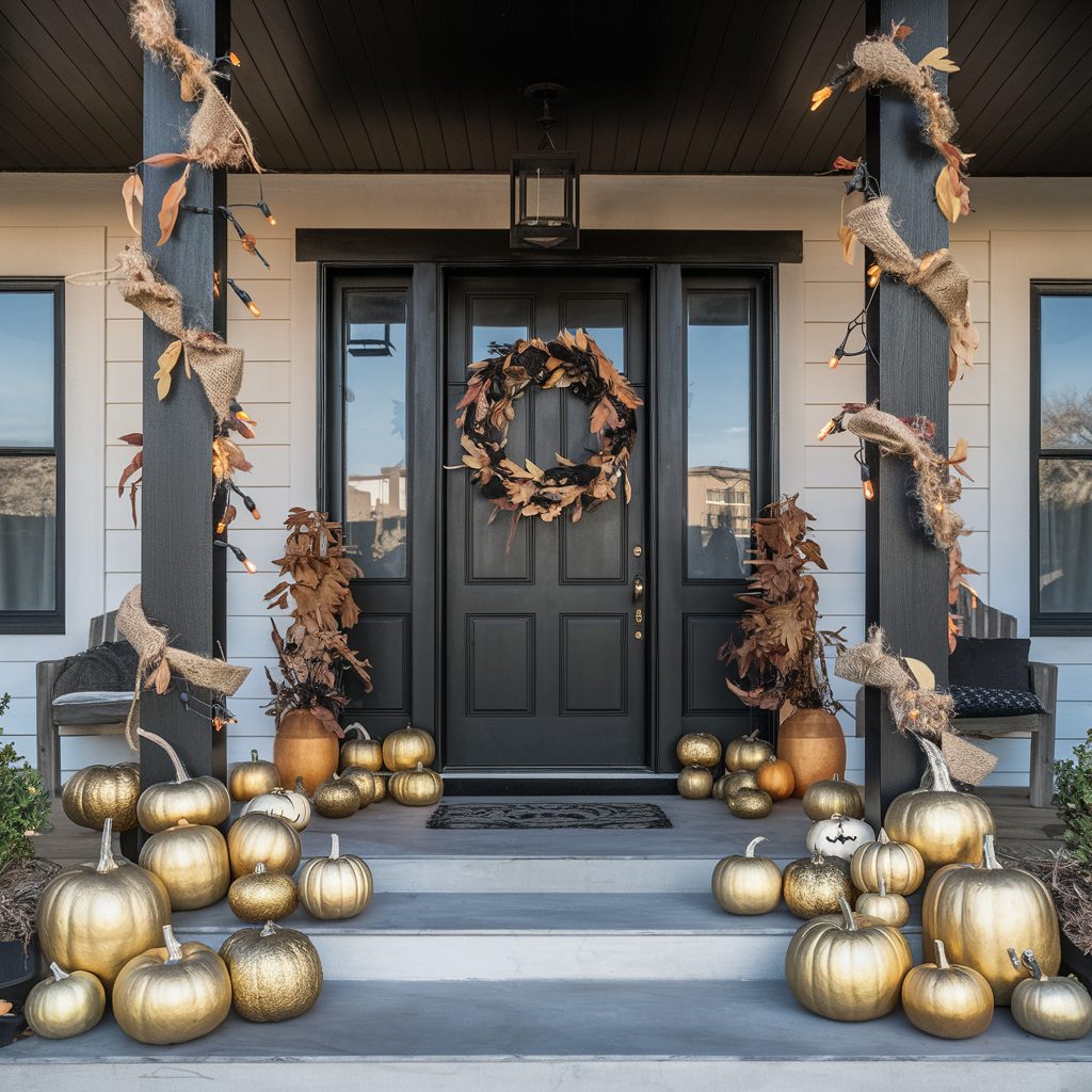 Pumpkins are among the most versatile decorative elements for Halloween, and with the right styling, they can elevate your porch into a truly elegant seasonal display. Instead of sticking to the classic orange, try using white pumpkins or painting them in metallic shades like gold, silver, or copper for a more refined and sophisticated look.