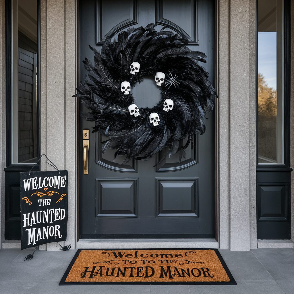 Your front door is the centerpiece of your porch, making it the perfect spot to showcase your Halloween creativity and set the tone for the rest of your decor. It’s where eyes naturally land first, so aim to make it both festive and memorable. Consider hanging a dramatic black feather wreath to add texture and mystery, or display a custom-made sign with a spooky or humorous Halloween message to immediately engage your guests.