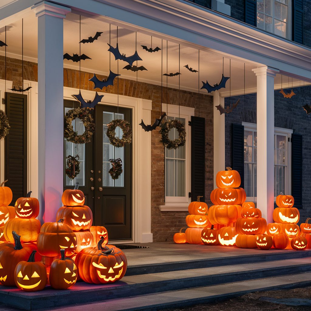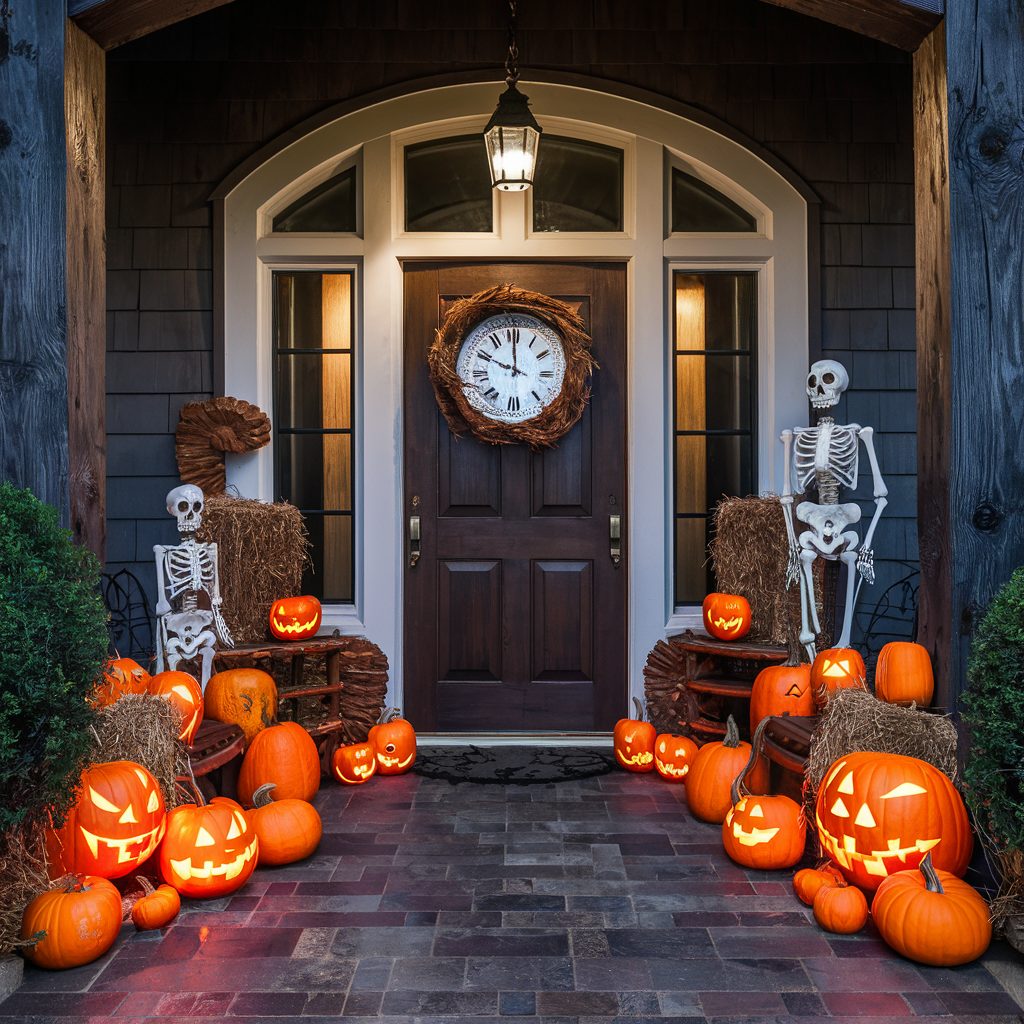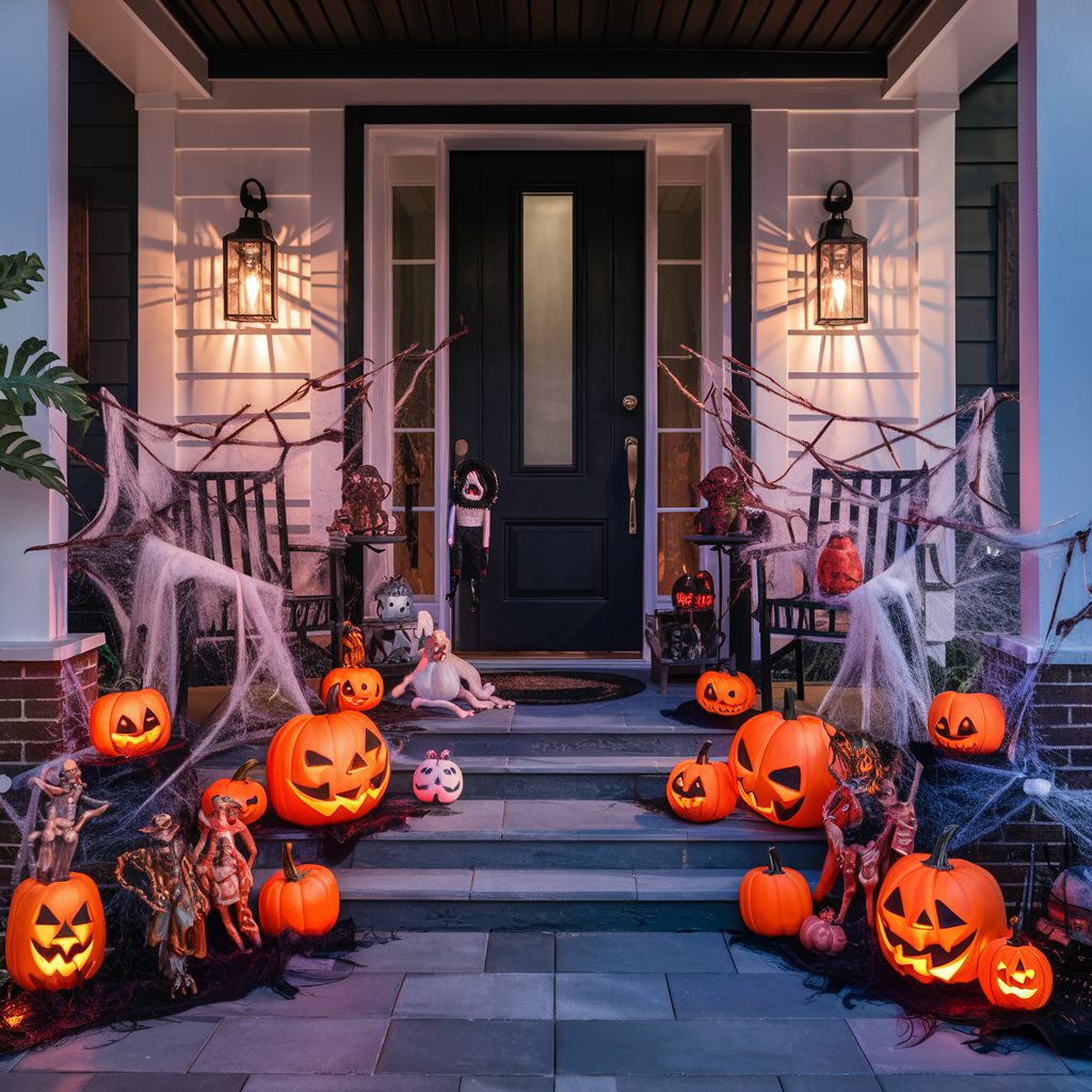 To reinforce the pumpkin theme, consider using pumpkin-shaped lanterns, themed wreaths, or even a row of illuminated pumpkins lining the walkway. Whether rustic or refined, pumpkins are the heart of Halloween decor, adding warmth, charm, and a festive touch to your porch.