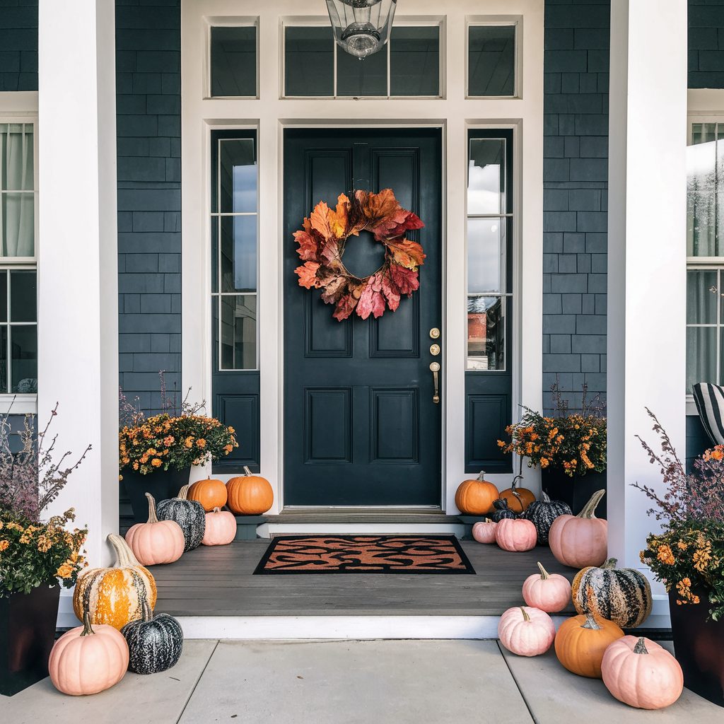 Arrange them in a symmetrical pattern along your porch steps or pathway to guide the eye toward the entrance and create a balanced visual effect. You can also blend in other natural elements—such as textured gourds, twisted branches, and seasonal flowers—to add richness and dimension to the setup.