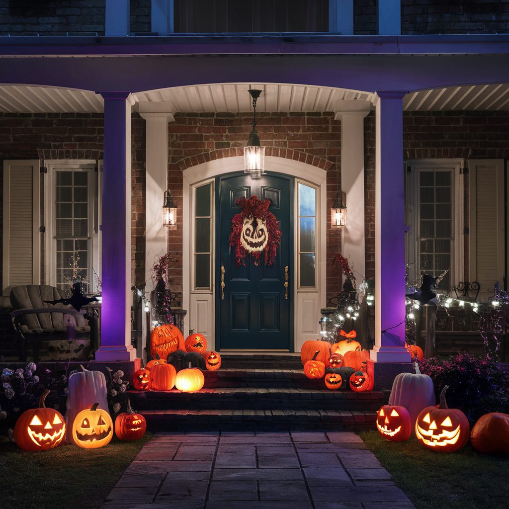To create that signature Halloween vibe, use orange and purple lights to cast a festive and mysterious glow. For a more understated yet eerie effect, flickering candles—real or battery-operated—and vintage-style lanterns work beautifully. You can also add extra character with illuminated pumpkins, glowing skulls, or ghost-shaped light fixtures to give your porch a truly haunting feel.